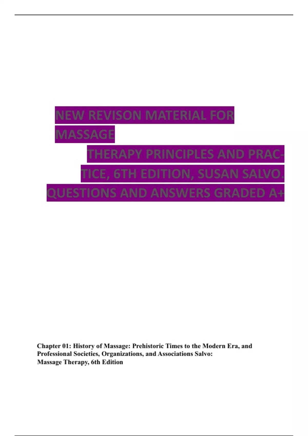NEW REVISON MATERIAL FOR MASSAGE THERAPY PRINCIPLES AND PRAC- TICE, 6TH EDITION, SUSAN SALVO. QUESTIONS AND ANSWERS GRADED A+