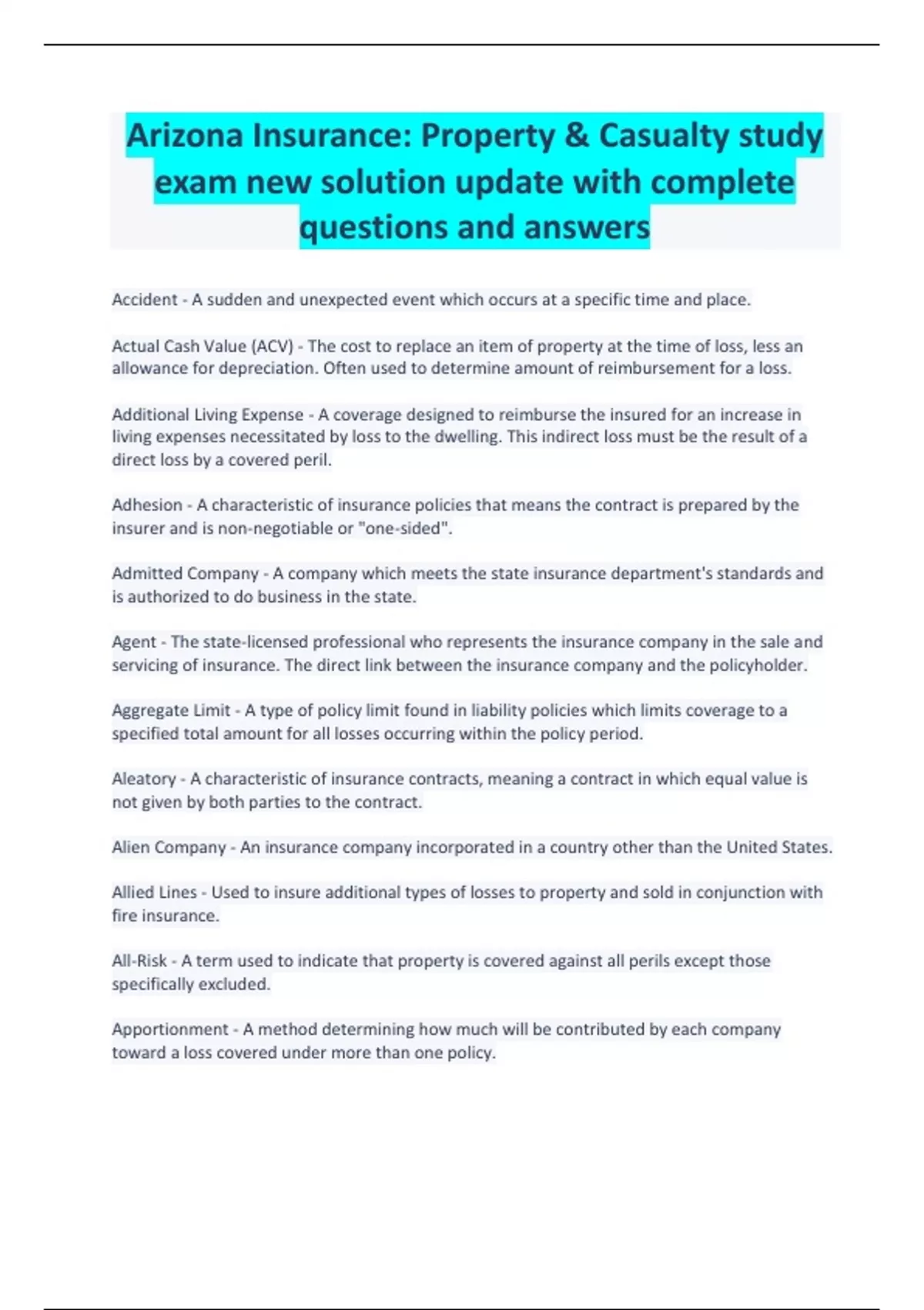 Arizona Insurance Property & Casualty study exam new solution update with complete questions and answers