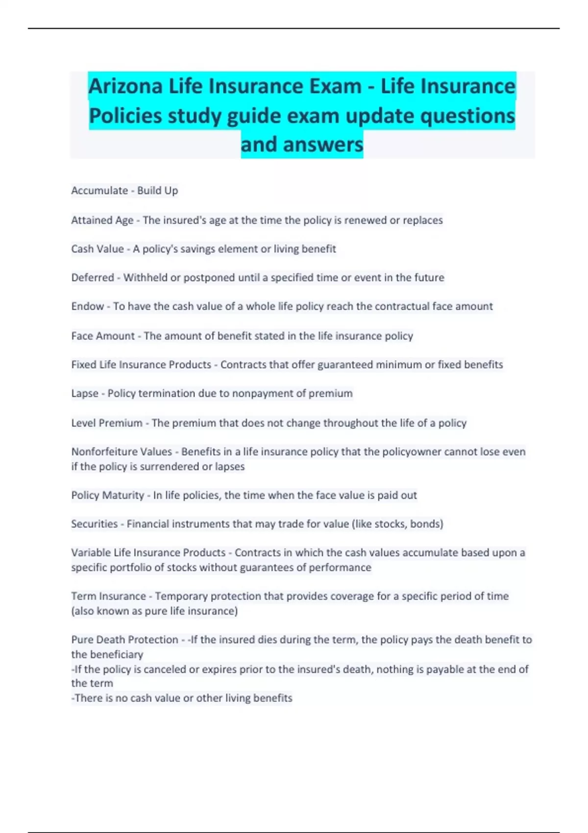 Arizona Life Insurance Exam - Life Insurance Policies study guide exam update questions and answers