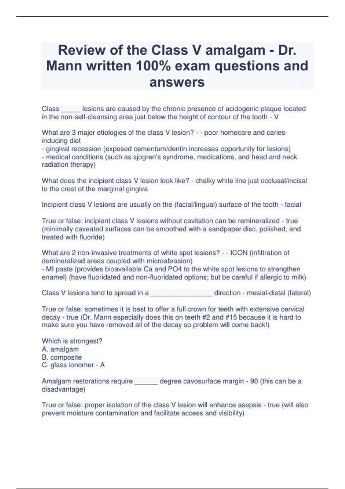 Review of the Class V amalgam - Dr. Mann written 100% exam questions and answers