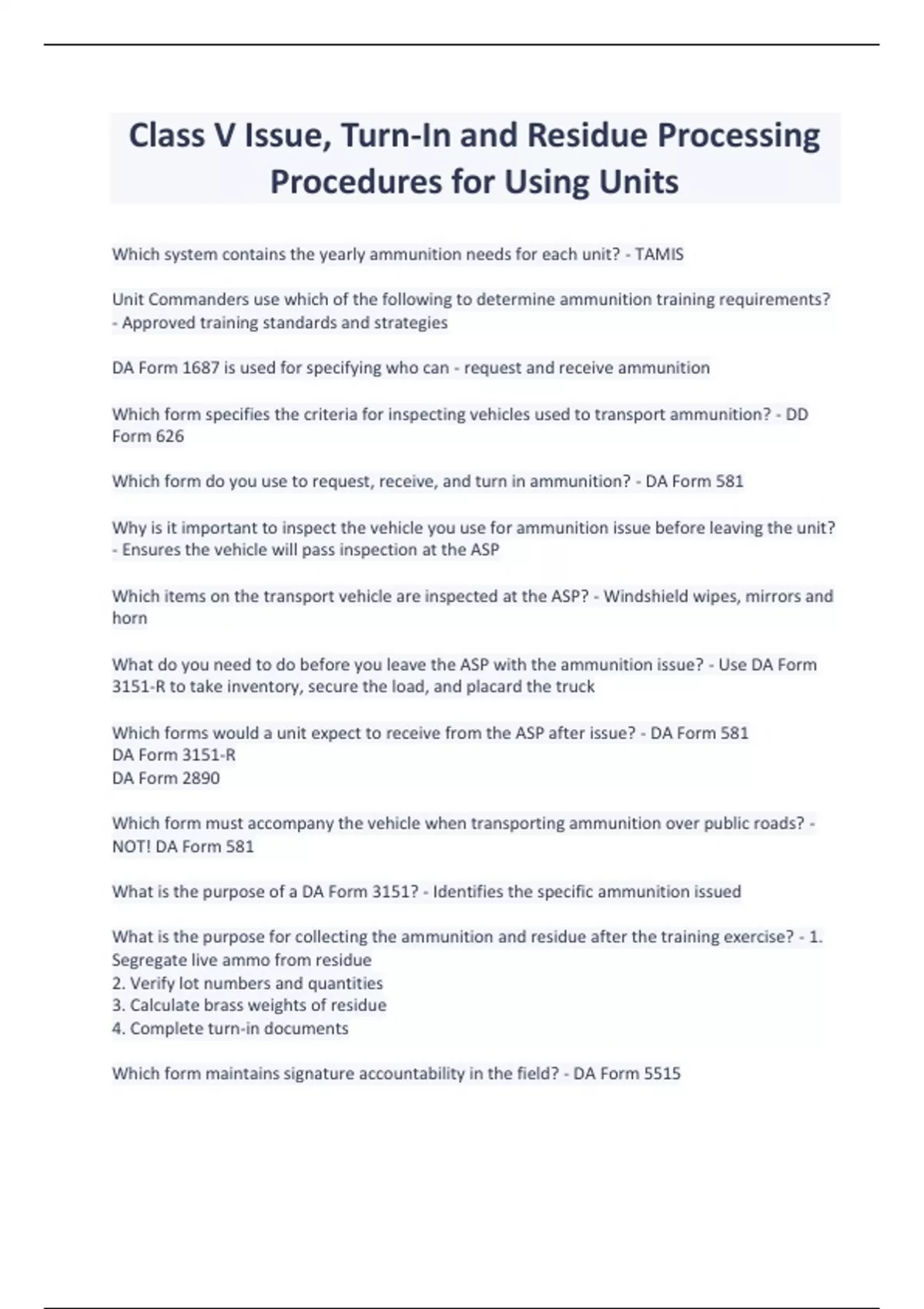 Class V Issue, Turn-In and Residue Processing Procedures for Using Units