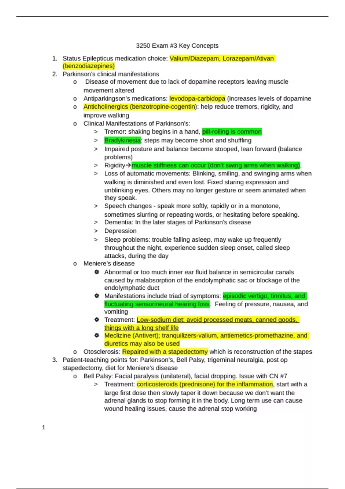 Status Epilepticus medication choice: Valium/Diazepam, Lorazepam/Ativan (benzodiazepines) 2. Parkinson’s clinical manifestations o Disease of movement due to lack of dopamine receptors leaving muscle movement altered o Antiparkingson’s medications: levodopa-carbidopa (increases levels of dopamine o Anticholinergics (benzotropine-cogentin): help reduce tremors, rigidity, and improve walking o Clinical Manifestations of Parkinson’s: > Tremor: shaking begins in a hand, pill-rolling is common > Bradykinesia: steps may become short and shuffling > Impaired posture and balance become stooped, lean forward (balance problems) > Rigiditymuscle stiffness can occur (don’t swing arms when walking), > Loss of automatic movements: Blinking, smiling, and swinging arms when walking is diminished and even lost. Fixed staring expression and unblinking eyes. Others may no longer gesture or seem animated when they speak. > Speech changes - speak more softly, rapidly or in a monotone, sometimes slurring or repeating words, or hesitating before speaking. > Dementia: In the later stages of Parkinson's disease > Depression > Sleep problems: trouble falling asleep, may wake up frequently throughout the night, experience sudden sleep onset, called sleep attacks, during the day