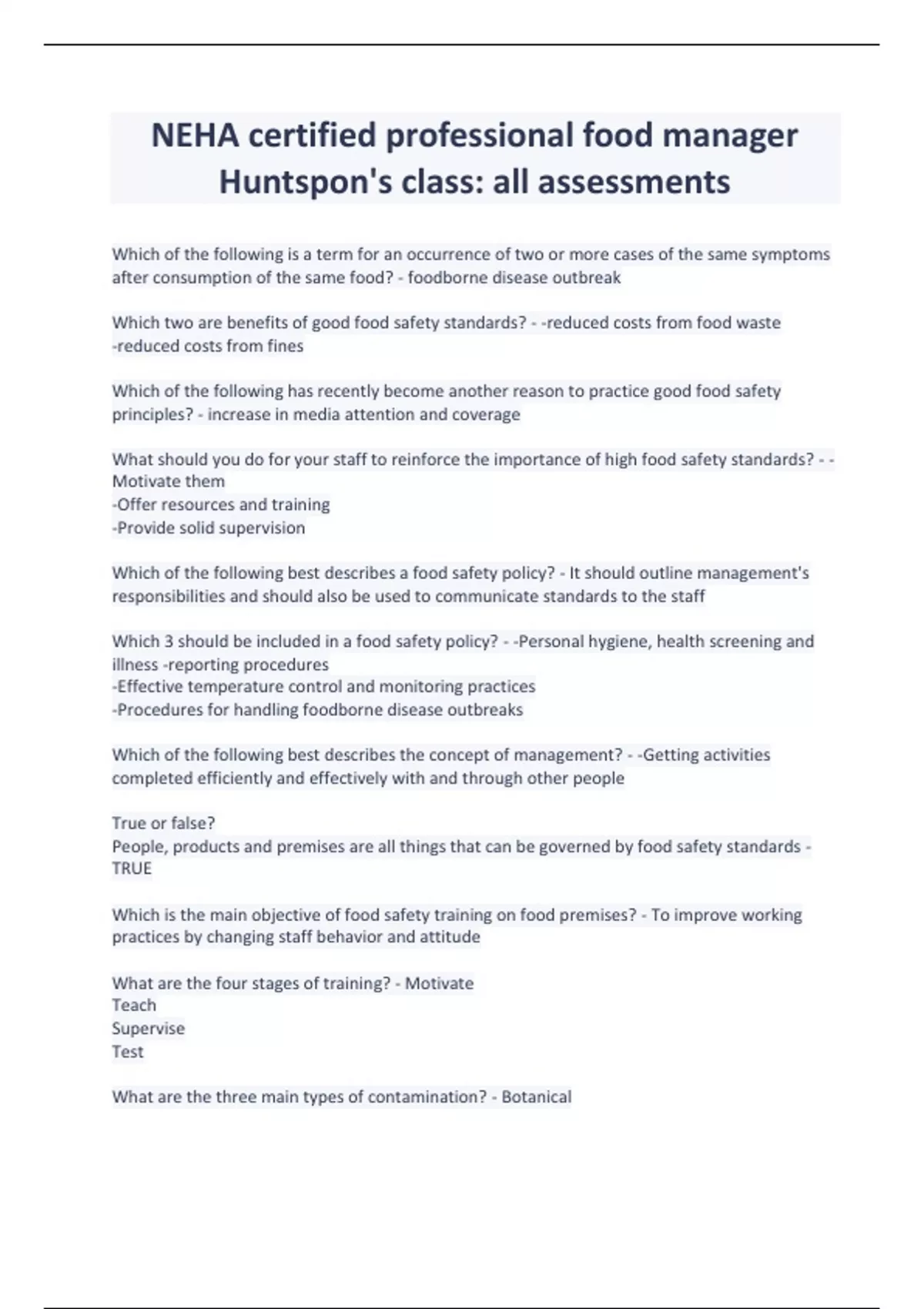 NEHA certified professional food manager Huntspon's class all assessments latest update