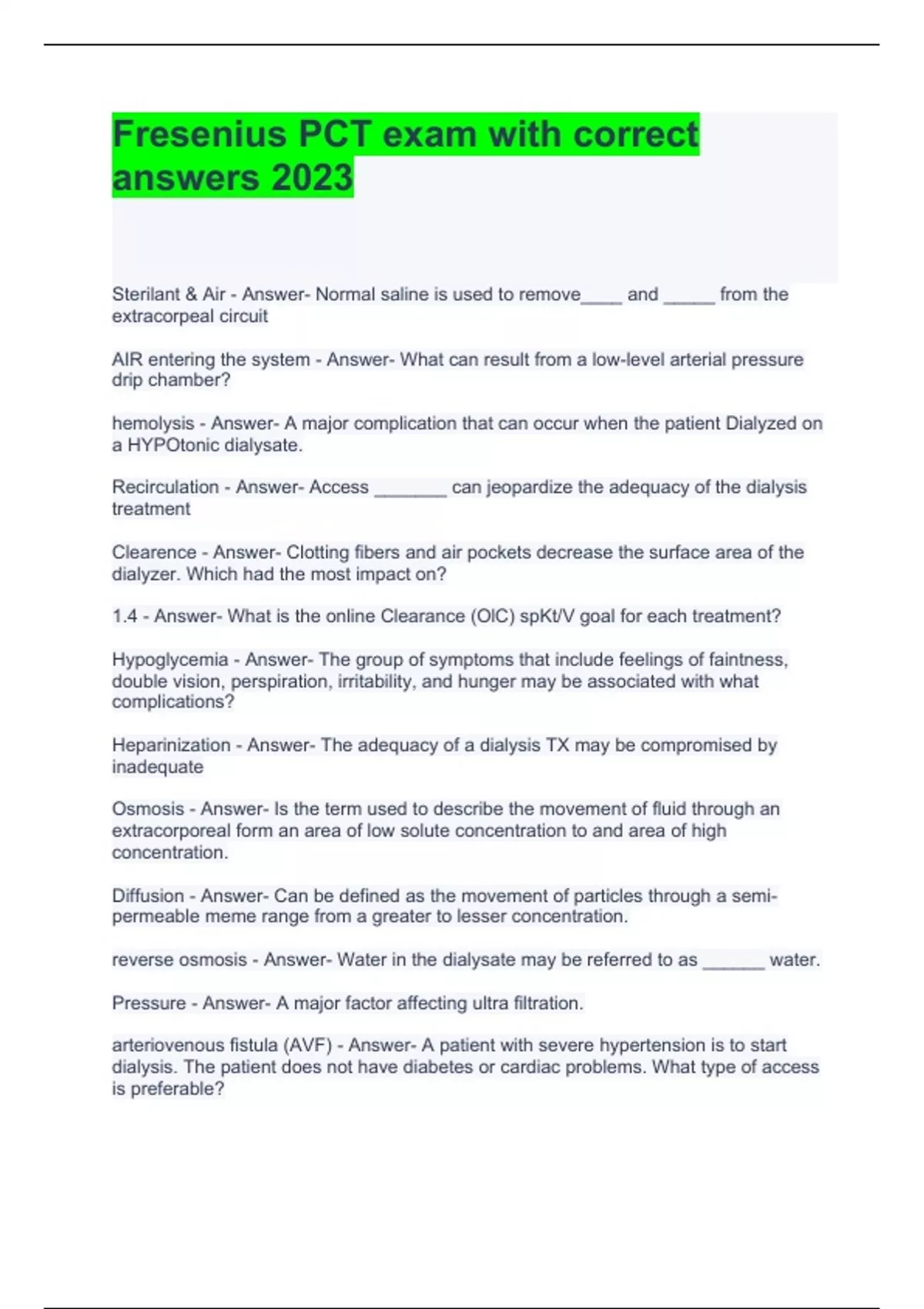 Fresenius PCT exam with correct answers 2023