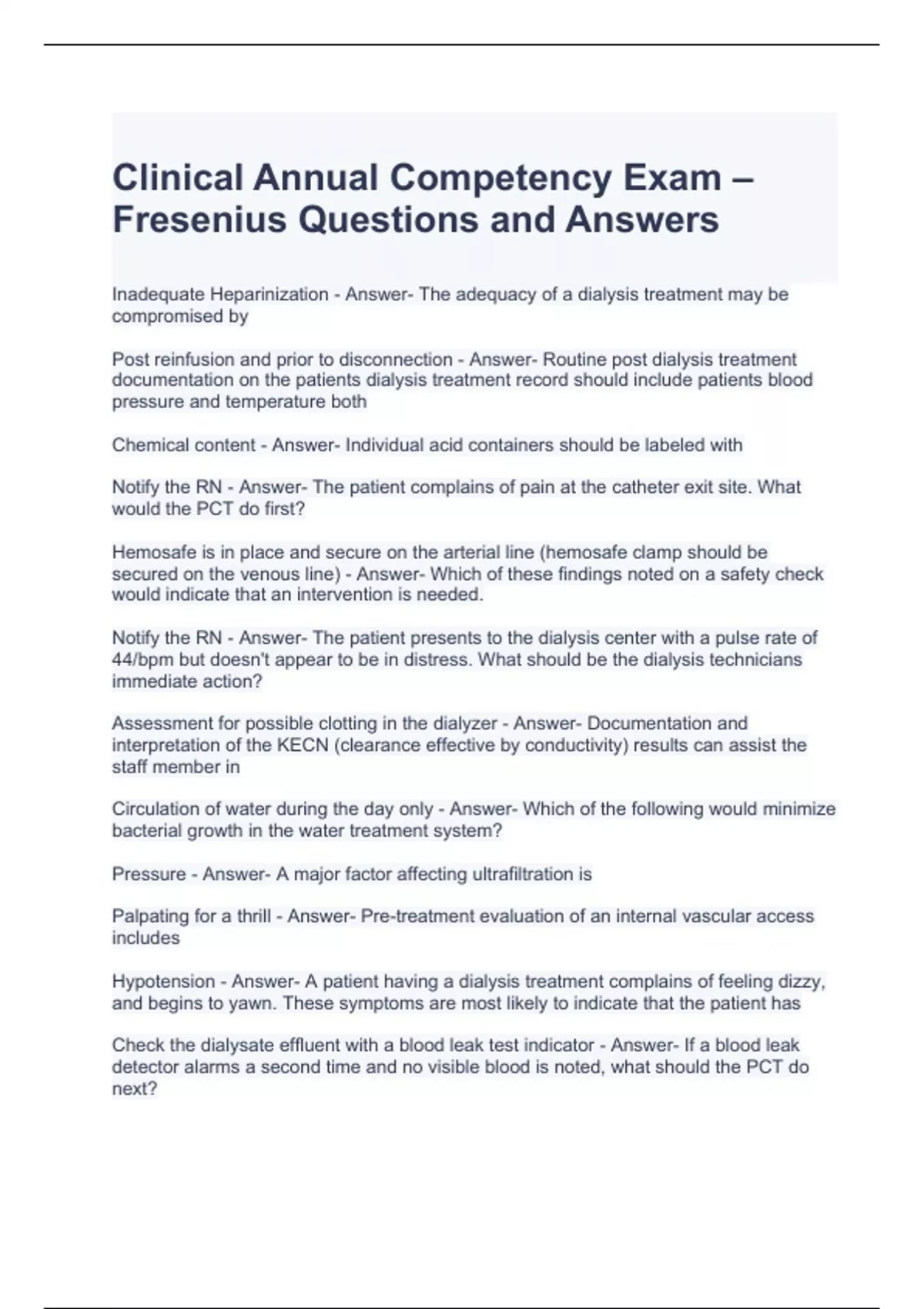 Clinical Annual Competency Exam – Fresenius Questions and Answers