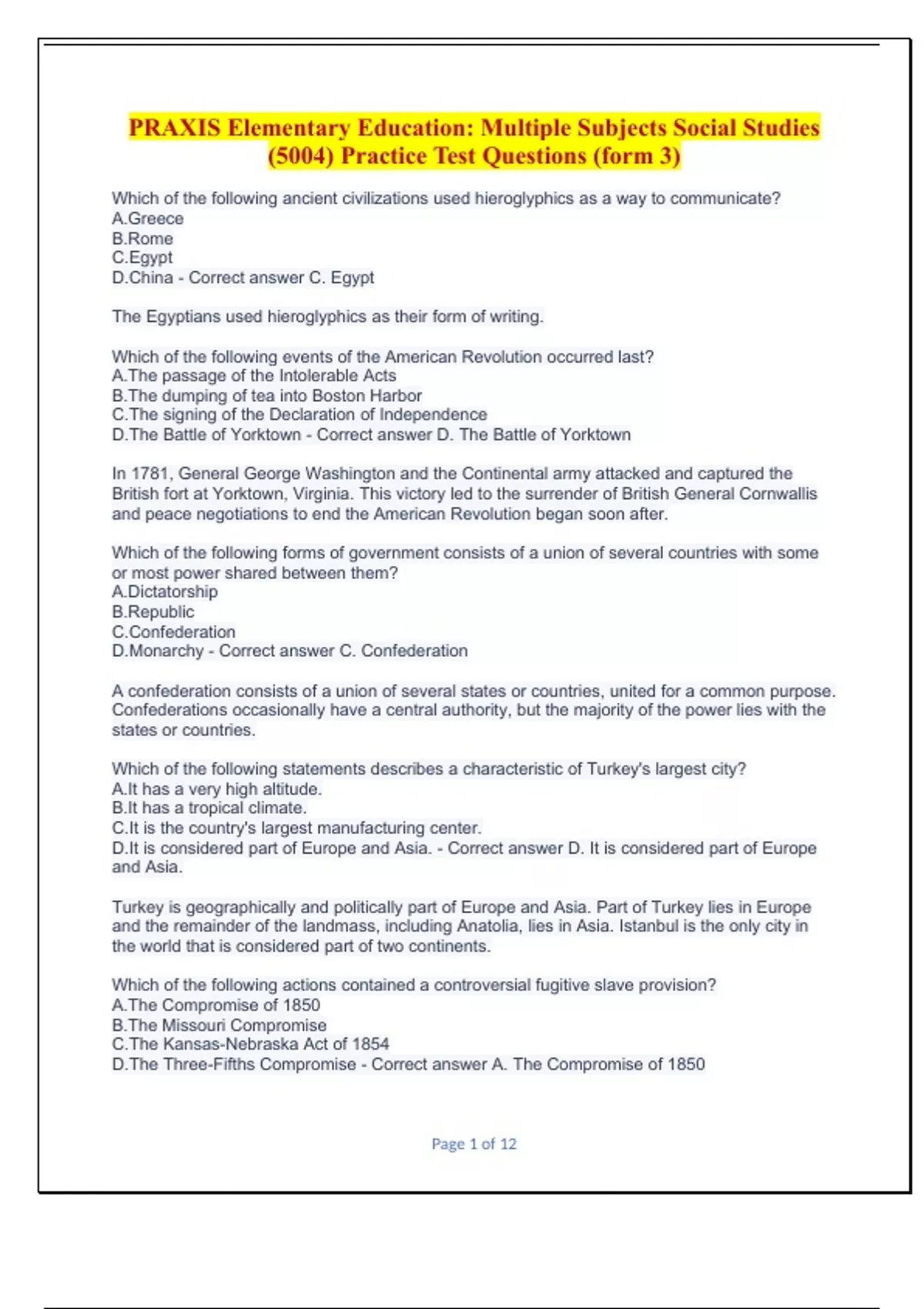 PRAXIS Elementary Education: Multiple Subjects Social Studies (5004) Practice Test Questions (form 3) PRAXIS Elementary Education: Multiple Subjects Social Studies (5004) Practice Test Questions (form 3)
