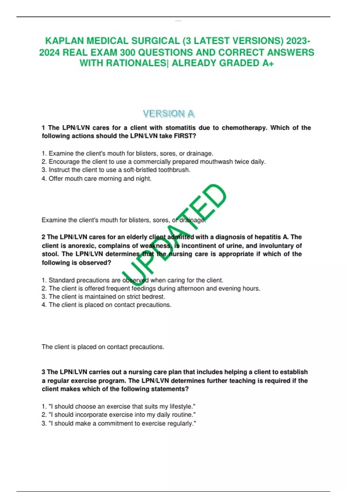 KAPLAN MEDICAL SURGICAL (3 LATEST VERSIONS) REAL EXAM 300 QUESTIONS AND CORRECT ANSWERS WITH RATIONALES| ALREADY GRADED A+ KAPLAN MEDICAL SURGICAL (3 LATEST VERSIONS) REAL EXAM 300 QUESTIONS AND CORRECT ANSWERS WITH RATIONALES| ALREADY GRADED A+