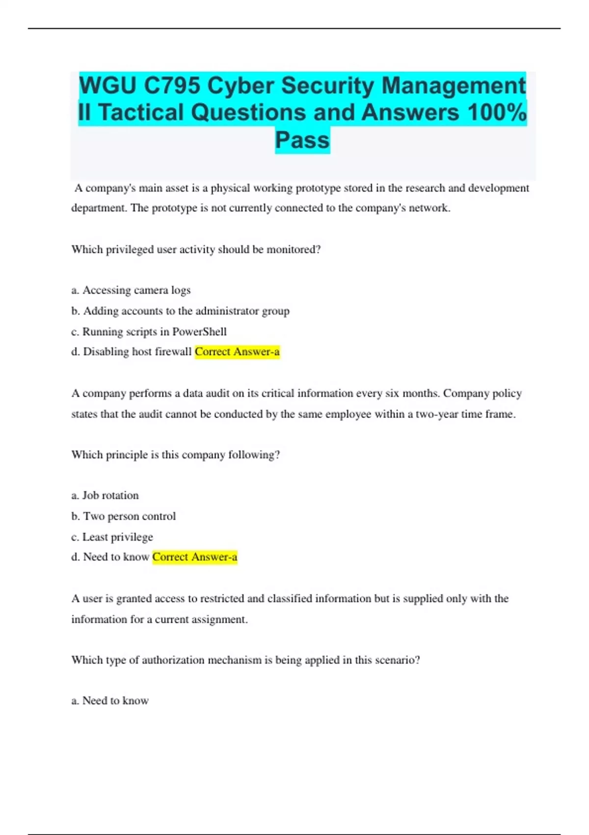 WGU C795 Cyber Security Management II Tactical Questions and Answers 100% Pass