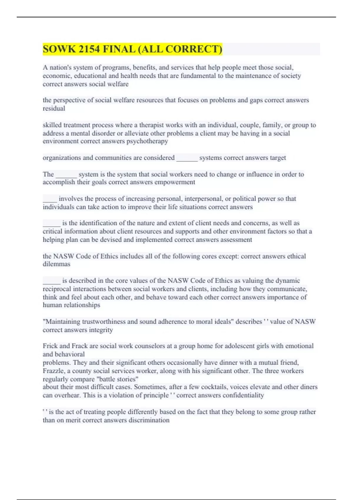 A nation's system of programs, benefits, and services that help people meet those social, economic, educational and health needs that are fundamental to the maintenance of society correct answers social welfare the perspective of social welfare resources that focuses on problems and gaps correct answers residual skilled treatment process where a therapist works with an individual, couple, family, or group to address a mental disorder or alleviate other problems a client may be having in a social environment correct answers psychotherapy organizations and communities are considered ______ systems correct answers target The ______ system is the system that social workers need to change or influence in order to accomplish their goals correct answers empowerment ____ involves the process of increasing personal, interpersonal, or political power so that individuals can take action to improve their life situations correct answers _____ is the identification of the nature and extent of client needs and concerns, as well as critical information about client resources and supports and other environment factors so that a helping plan can be devised and implemented correct answers assessment the NASW Code of Ethics includes all of the following cores except: correct answers ethical dilemmas _____ is described in the core values of the NASW Code of Ethics as valuing the dynamic reciprocal interactions between social workers and clients, including how they communicate, think and feel about each other, and behave toward each other correct answers importance of human relationships "Maintaining trustworthiness and sound adherence to moral ideals" describes ' ' value of NASW correct answers integrity Frick and Frack are social work counselors at a group home for adolescent girls with emotional and behavioral problems. They and their significant others occasionally have dinner with a mutual friend, Frazzle, a county social services worker, along with his significant other. The three workers regularly compare "battle stories" about their most difficult cases. Sometimes, after a few cocktails, voices elevate and other diners can overhear. This is a violation of principle ' ' correct answers confidentiality ' ' is the act of treating people differently based on the fact that they belong to some group rather than on merit correct answers discrimination