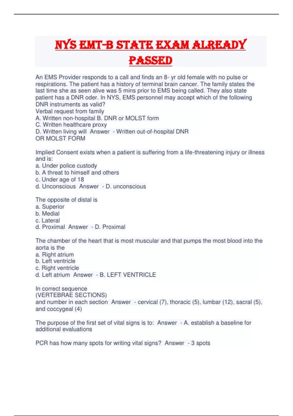 NYS EMT-B STATE EXAM already passed