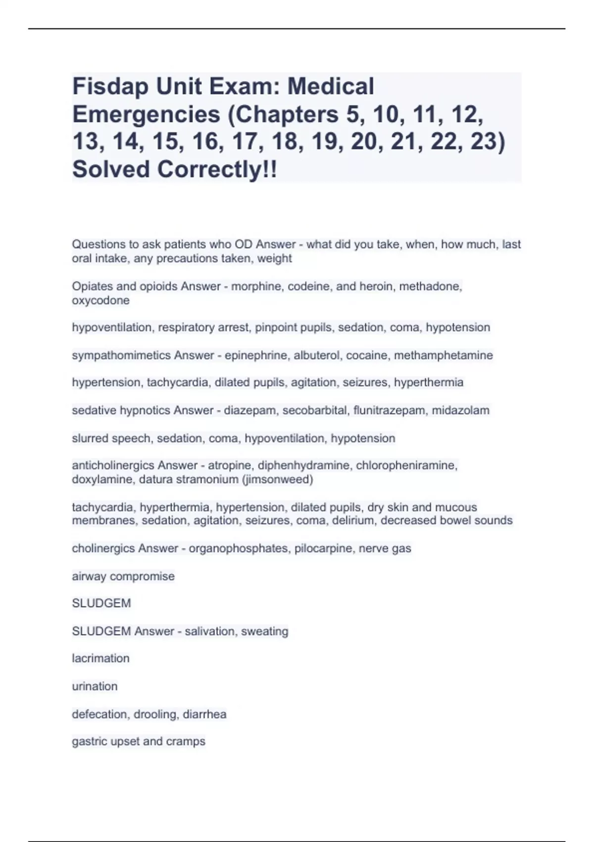Fisdap Unit Exam: Medical Emergencies (Chapters 5, 10, 11, 12, 13, 14, 15, 16, 17, 18, 19, 20, 21, 22, 23) Solved Correctly!!