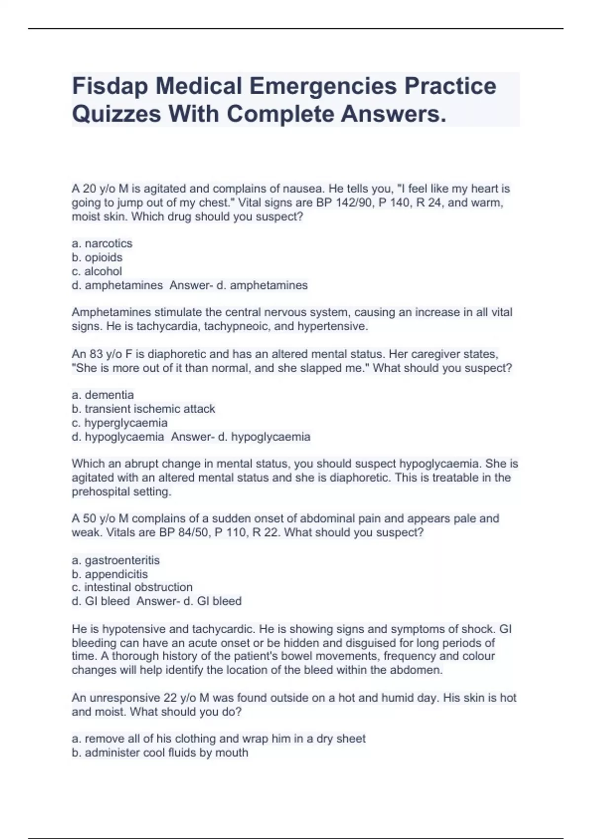 Fisdap Medical Emergencies Practice Quizzes With Complete Answers.