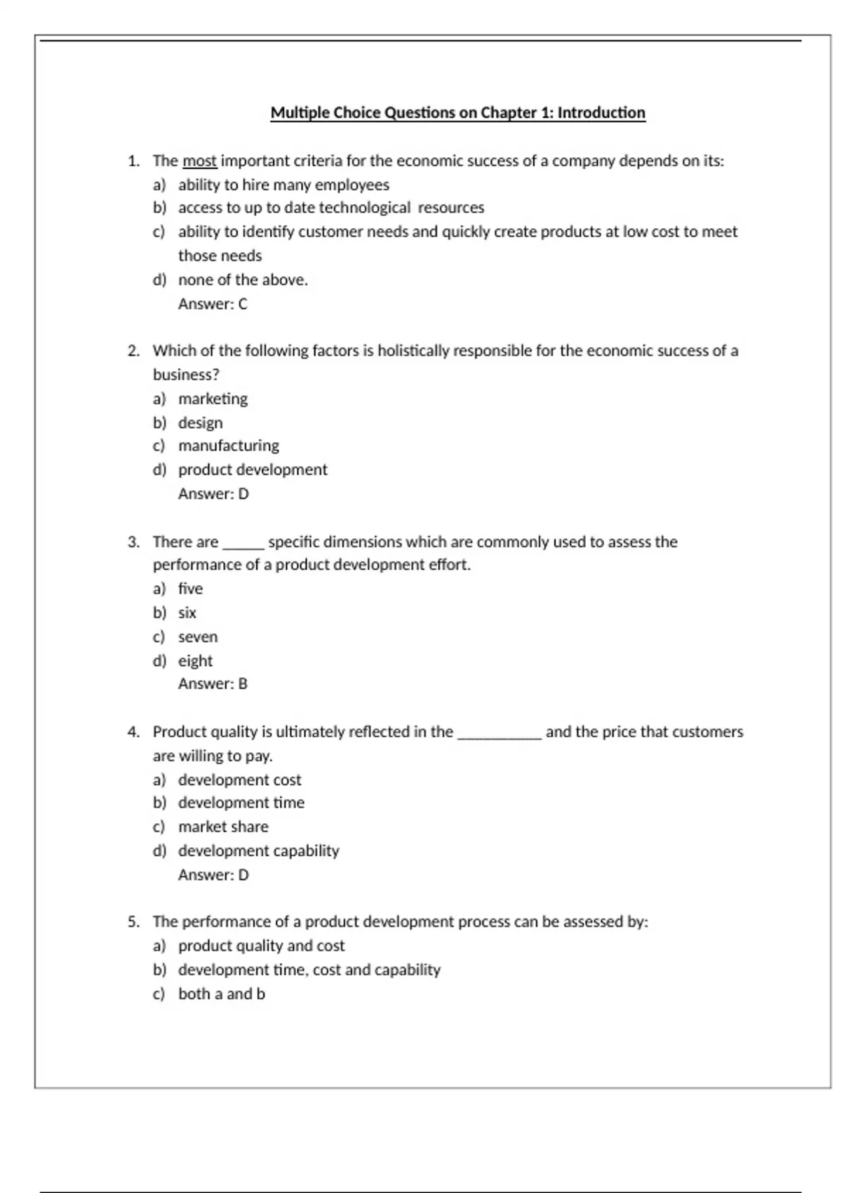 1. The most important criteria for the economic success of a company depends on its: a) ability to hire many employees b) access to up to date technological resources c) ability to identify customer needs and quickly create products at low cost to meet those needs d) none of the above. Answer: C 2. Which of the following factors is holistically responsible for the economic success of a business? a) marketing b) design c) manufacturing d) product development Answer: D 3. There are _____ specific dimensions which are commonly used to assess the performance of a product development effort. a) five b) six c) seven d) eight Answer: B 4. Product quality is ultimately reflected in the __________ and the price that customers are willing to pay. a) development cost b) development time c) market share d) development capability Answer: D 5. The performance of a product development process can be assessed by: a) product quality and cost b) development time, cost and capability c) both a and b d) none of the above Answer: C 6. The success of the product development process of a company primarily depends on: a) the company name b) high performance, product quality and cost, development time, cost & capabilities c) distribution partners d) company’s net worth Answer: 7. The success of the product development process of a company primarily depends on: a) product quality and cost b) development time and cost c) development capabilities d) all of the above Answer: D 8. Sustainable product development demands: a) that the products should be made using cheapest labor b) ecologically sound use of resources and reduction of hazardous waste byproducts c) that the business organizations should be not-for-profit d) larger development costs and time Answer: B 9. Product development is an interdisciplinary activity with three central functions. These are: a) Design, Marketing, and Manufacturing b) Design, Sales, and Marketing c) Marketing, Manufacturing and Sales d) Design, Finance, and Manufacturing