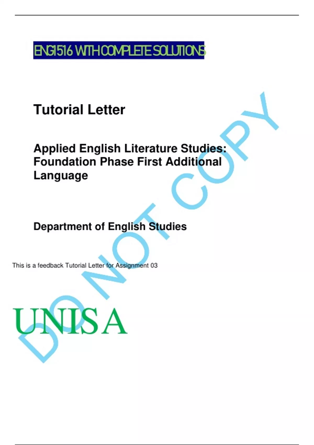 ENG1516 WITH COMPLETE SOLUTIONS Tutorial Letter Applied English Literature Studies: Foundation Phase First Additional Language Department of English Studies This is a feedback Tutorial Letter for Assignment 03 UNISA Dear Student FEEDBACK OF ENG1516 ASSIGNMENT 03 Thank you for completing your third assignment. This feedback tutorial letter provides you with guidelines and examples of how you could have responded to the questions set for the assignment. Please study it alongside the specific feedback comments that you received from your marker. If you are unsure about why you received your mark, please contact Mr Russell Goldman at: Question 1.1 Identify three poetic techniques which serve to highlight the emotions experienced by the children in a crowded taxi during the Covid pandemic. This question requires you to name three poetic techniques used in the poem to highlight the emotions experienced by the children and include quotes from the poem to support the techniques you named. Some examples of poetic techniques you could have identified are: Onomatopoeia, to enhance feelings of excitement or fear: - School starting now, we together bleat - Small Sam sneezes over us, so we screech Alliteration, to enhance feelings of calm: - Driver Lebo soothes us with sweets to eat Internal rhyme, to enhance feelings of panic, concern, or fear: - Don’t swipe; use this paper wipe; please don’t leak! Question 1.2 Examine the end-rhymes “bleat” and “screech”. What do these words denote about the children’s attitudes within the context of the poem? This is a relatively straight-forward question that you could have answered in several ways, but ideally you should have identified that both words are examples of onomatopoeia, are both sounds made by animals and, thus, denote a sense of panic, fear, agitation or excitement in the children.