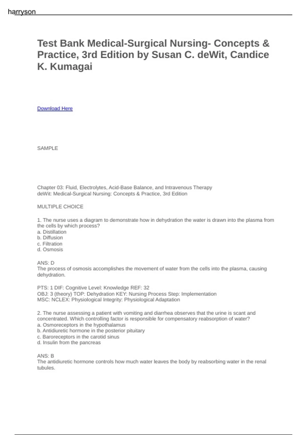 Test Bank Medical-Surgical Nursing- Concepts & Practice, 3rd Edition by Susan C. deWit, Candice K. Kumagai Test Bank Medical-Surgical Nursing- Concepts & Practice, 3rd Edition by Susan C. deWit, Candice K. Kumagai Download Here SAMPLE Chapter 03: Fluid, Electrolytes, Acid-Base Balance, and Intravenous Therapy deWit: Medical-Surgical Nursing: Concepts & Practice, 3rd Edition MULTIPLE CHOICE 1. The nurse uses a diagram to demonstrate how in dehydration the water is drawn into the plasma from the cells by which process? a. Distillation b. Diffusion c. Filtration d. Osmosis ANS: D The process of osmosis accomplishes the movement of water from the cells into the plasma, causing dehydration. PTS: 1 DIF: Cognitive Level: Knowledge REF: 32 OBJ: 3 (theory) TOP: Dehydration KEY: Nursing Process Step: Implementation MSC: NCLEX: Physiological Integrity: Physiological Adaptation 2. The nurse assessing a patient with vomiting and diarrhea observes that the urine is scant and concentrated. Which controlling factor is responsible for compensatory reabsorption of water? a. Osmoreceptors in the hypothalamus b. Antidiuretic hormone in the posterior pituitary c. Baroreceptors in the carotid sinus d. Insulin from the pancreas ANS: B The antidiuretic hormone controls how much water leaves the body by reabsorbing water in the renal tubules. harryson PTS: 1 DIF: Cognitive Level: Comprehension REF: 30 OBJ: 2 (theory) TOP: Regulation of Body Fluids KEY: Nursing Process Step: Implementation MSC: NCLEX: Physiological Integrity: Physiological Adaptation 3. The nurse uses a picture to show how ions equalize their concentration by which passive transport process? a. Osmosis b. Filtration c. Titration d. Diffusion ANS: D Diffusion is the process by which substances move back and forth across compartment membranes until they are equally divided. PTS: 1 DIF: Cognitive Level: Knowledge REF: 31 OBJ: 2 (theory) TOP: Diffusion KEY: Nursing Process Step: Implementation MSC: NCLEX: Physiological Integrity: Physiological Adaptation 4. Which term describes the active transport process that moves sodium and potassium into or out of cells? a. Filtration b. Sodium pump c. Diffusion d. Osmosis ANS: B The sodium pump is the mechanism by which sodium and potassium are moved into or out of cells regardless of the concentration. PTS: 1 DIF: Cognitive Level: Knowledge REF: 32 OBJ: 2 (theory) TOP: Active Transport KEY: Nursing Process Step: Implementation MSC: NCLEX: Physiological Integrity: Physiological Adaptation 5. The patient taking furosemide (Lasix) to correct excess edema shows a weight loss of 5.5 pounds in 24 hours. The nurse calculates that this weight loss is equivalent to how many liters (L) of fluid? a. 1 L b. 1.5 L c. 2.0 L d. 2.5 L ANS: D Each kilogram (2.2 pounds) of weight loss is equivalent to 1 liter of fluid. Therefore, 5.5 pounds ÷ 2.2 pounds = 2.5 liters. PTS: 1 DIF: Cognitive Level: Application REF: 33, Clinical Cues OBJ: 1 (clinical) TOP: Fluid Loss KEY: Nursing Process Step: Assessment MSC: NCLEX: Physiological Integrity: Physiological Adaptation 6. The nurse is caring for a patient with a potassium level of 2.9 mEq/L. The nurse should carefully monitor the patient for which potential problem? a. Excessive urinary output