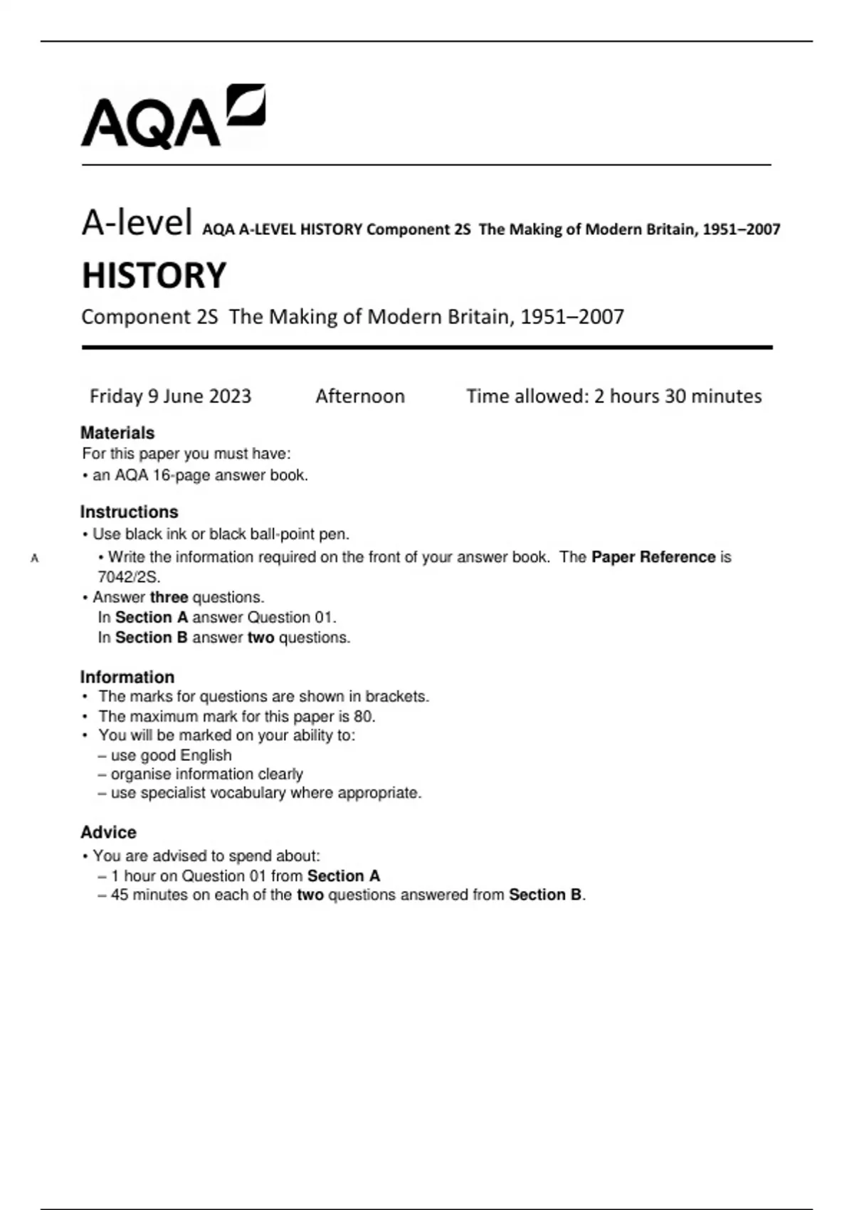 AQA A-LEVEL HISTORY Component 2S The Making of Modern Britain, 1951–2007
