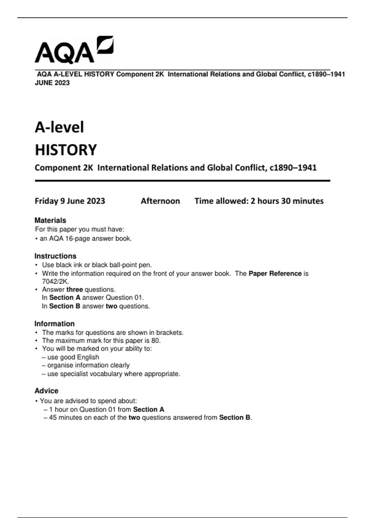 AQA A-LEVEL HISTORY Component 2K International Relations and Global Conflict, c1890–1941 JUNE 2023