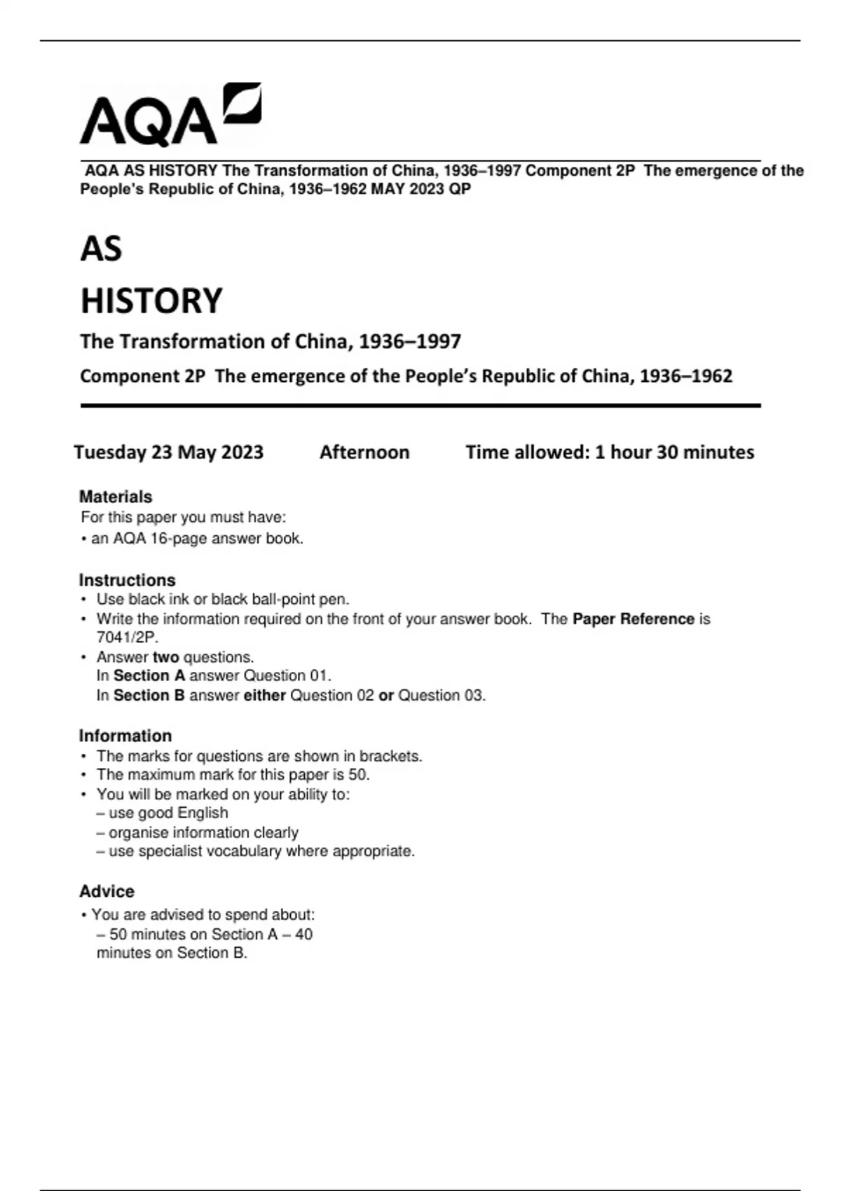 AQA AS HISTORY The Transformation of China, 1936–1997 Component 2P The emergence of the People’s Republic of China, 1936–1962 MAY 2023 QP