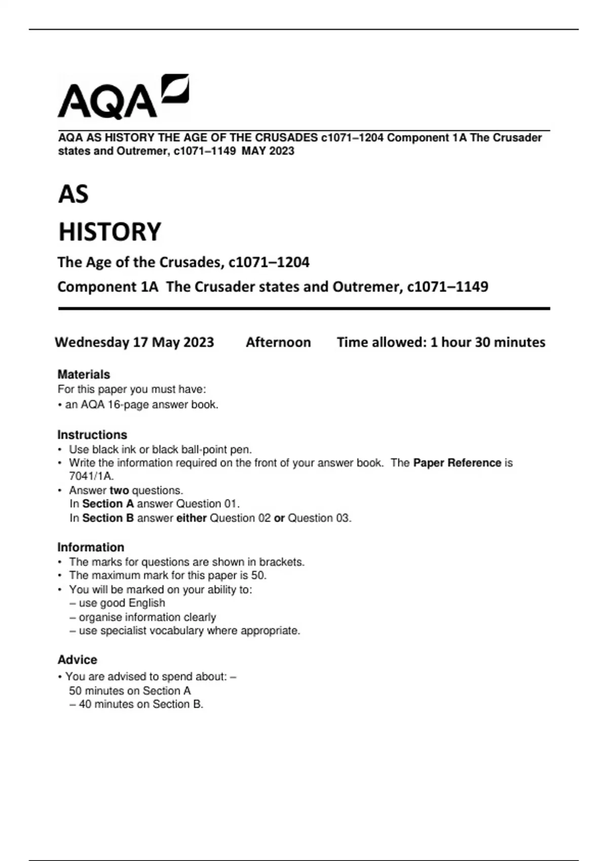 AQA AS HISTORY THE AGE OF THE CRUSADES c1071–1204 Component 1A The Crusader states and Outremer, c1071–1149 MAY 2023