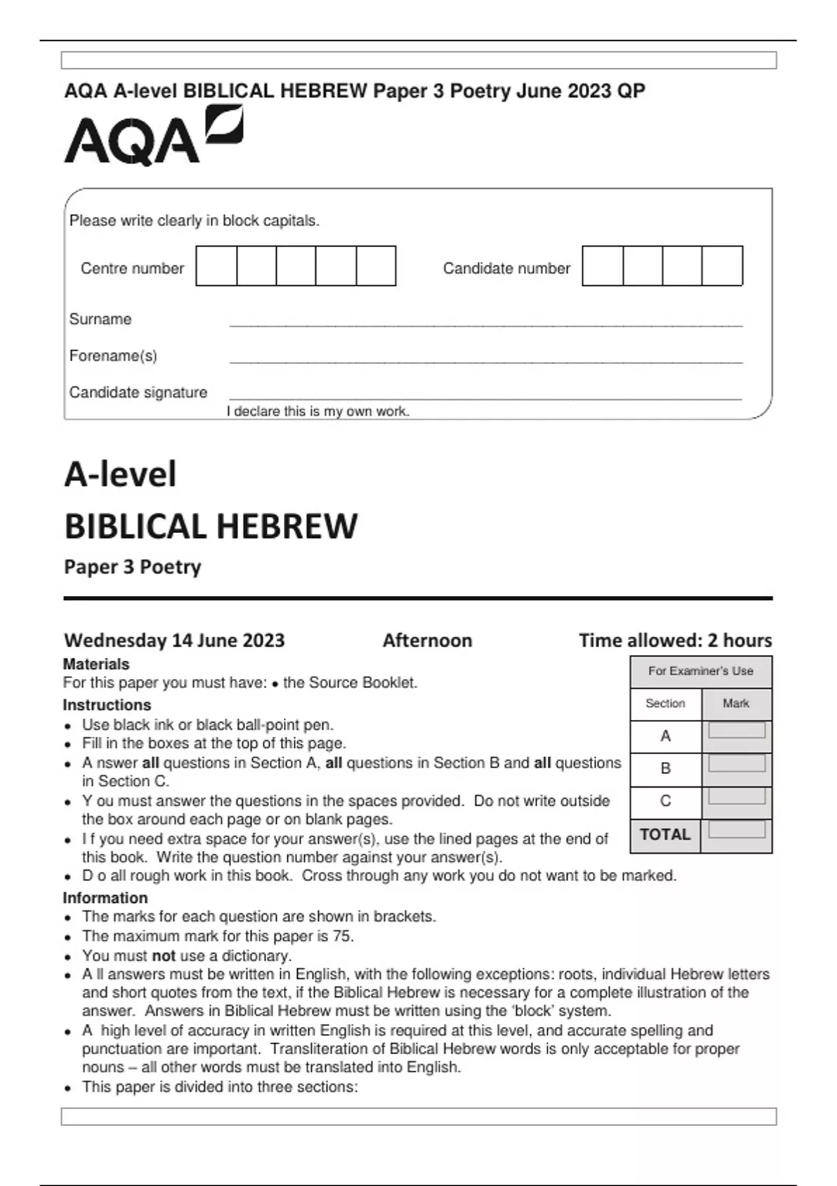 AQA A-level BIBLICAL HEBREW Paper 3 Poetry June 2023 QP