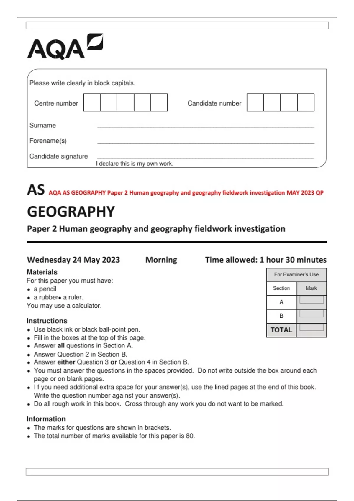 AQA AS GEOGRAPHY Paper 2 Human geography and geography fieldwork investigation MAY 2023 QP