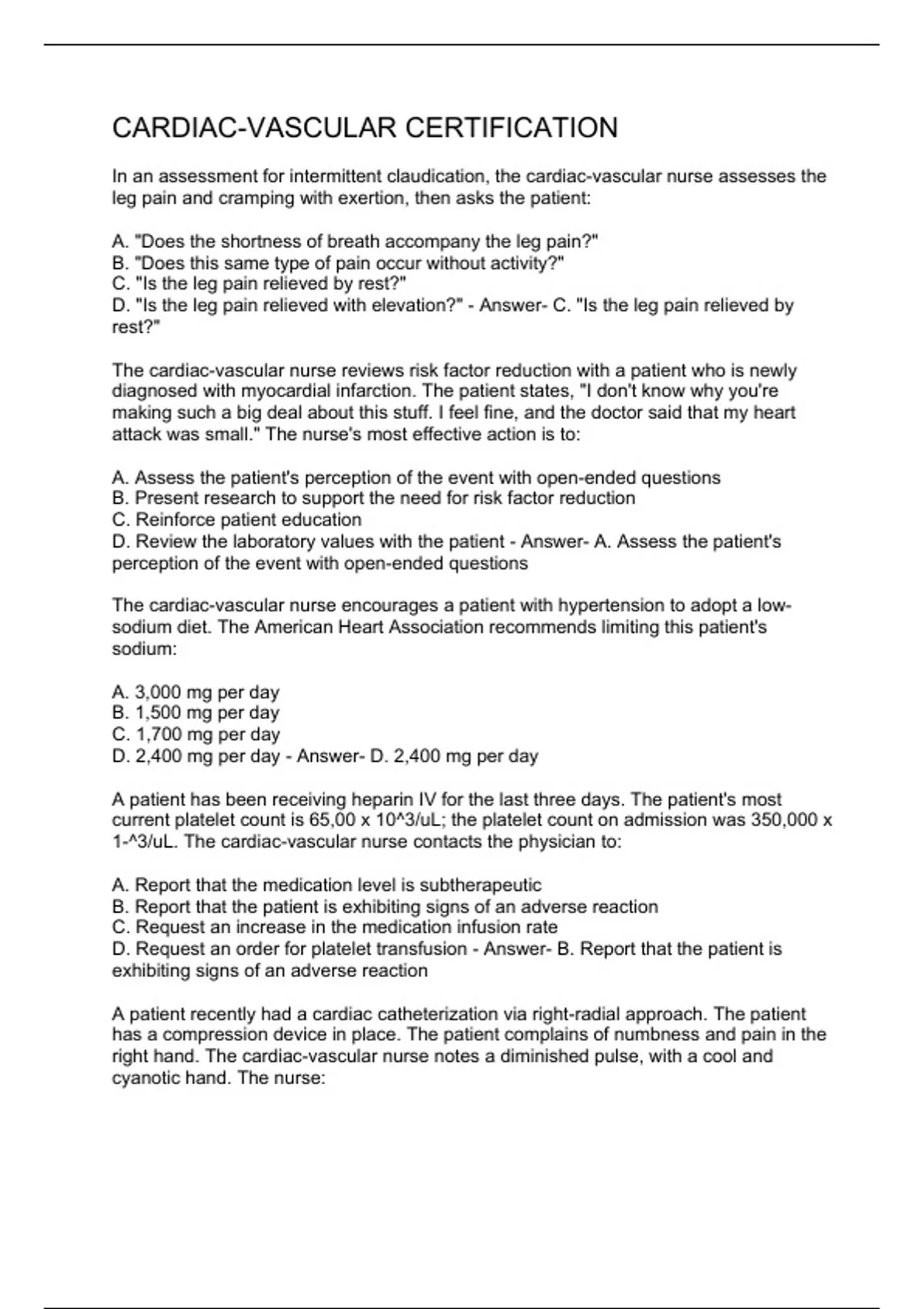 In an assessment for intermittent claudication, the cardiac-vascular nurse assesses the leg pain and cramping with exertion, then asks the patient: A. "Does the shortness of breath accompany the leg pain?" B. "Does this same type of pain occur without activity?" C. "Is the leg pain relieved by rest?" D. "Is the leg pain relieved with elevation?" - Answer- C. "Is the leg pain relieved by rest?" The cardiac-vascular nurse reviews risk factor reduction with a patient who is newly diagnosed with myocardial infarction. The patient states, "I don't know why you're making such a big deal about this stuff. I feel fine, and the doctor said that my heart attack was small." The nurse's most effective action is to: A. Assess the patient's perception of the event with open-ended questions B. Present research to support the need for risk factor reduction C. Reinforce patient education D. Review the laboratory values with the patient - Answer- A. Assess the patient's perception of the event with open-ended questions The cardiac-vascular nurse encourages a patient with hypertension to adopt a low-sodium diet. The American Heart Association recommends limiting this patient's sodium: A. 3,000 mg per day B. 1,500 mg per day C. 1,700 mg per day D. 2,400 mg per day - Answer- D. 2,400 mg per day A patient has been receiving heparin IV for the last three days. The patient's most current platelet count is 65,00 x 10^3/uL; the platelet count on admission was 350,000 x 1-^3/uL. The cardiac-vascular nurse contacts the physician to: A. Report that the medication level is subtherapeutic B. Report that the patient is exhibiting signs of an adverse reaction C. Request an increase in the medication infusion rate D. Request an order for platelet transfusion - Answer- B. Report that the patient is exhibiting signs of an adverse reaction A patient recently had a cardiac catheterization via right-radial approach. The patient has a co
