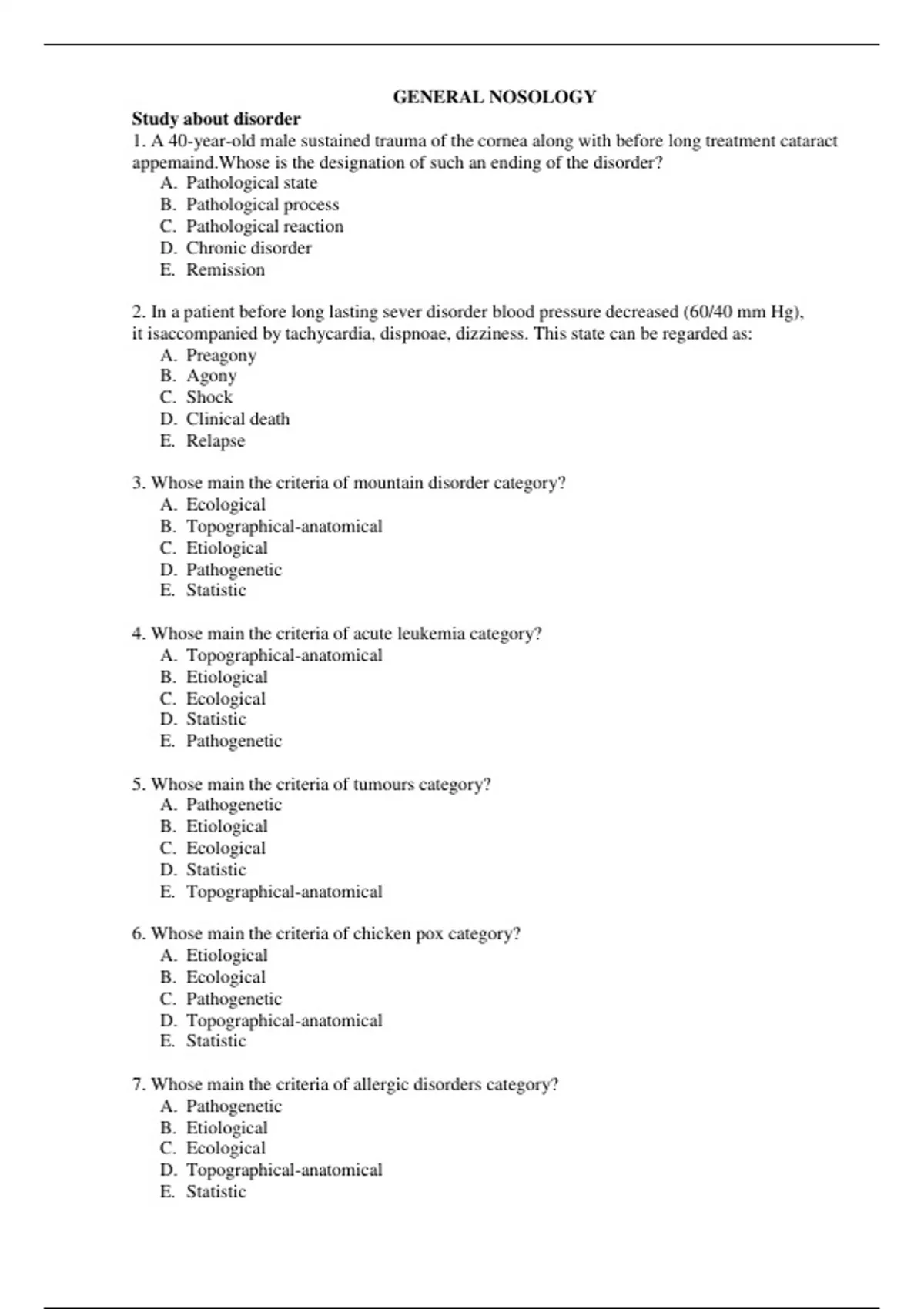 GENERAL NOSOLOGY QUESTION BANK.