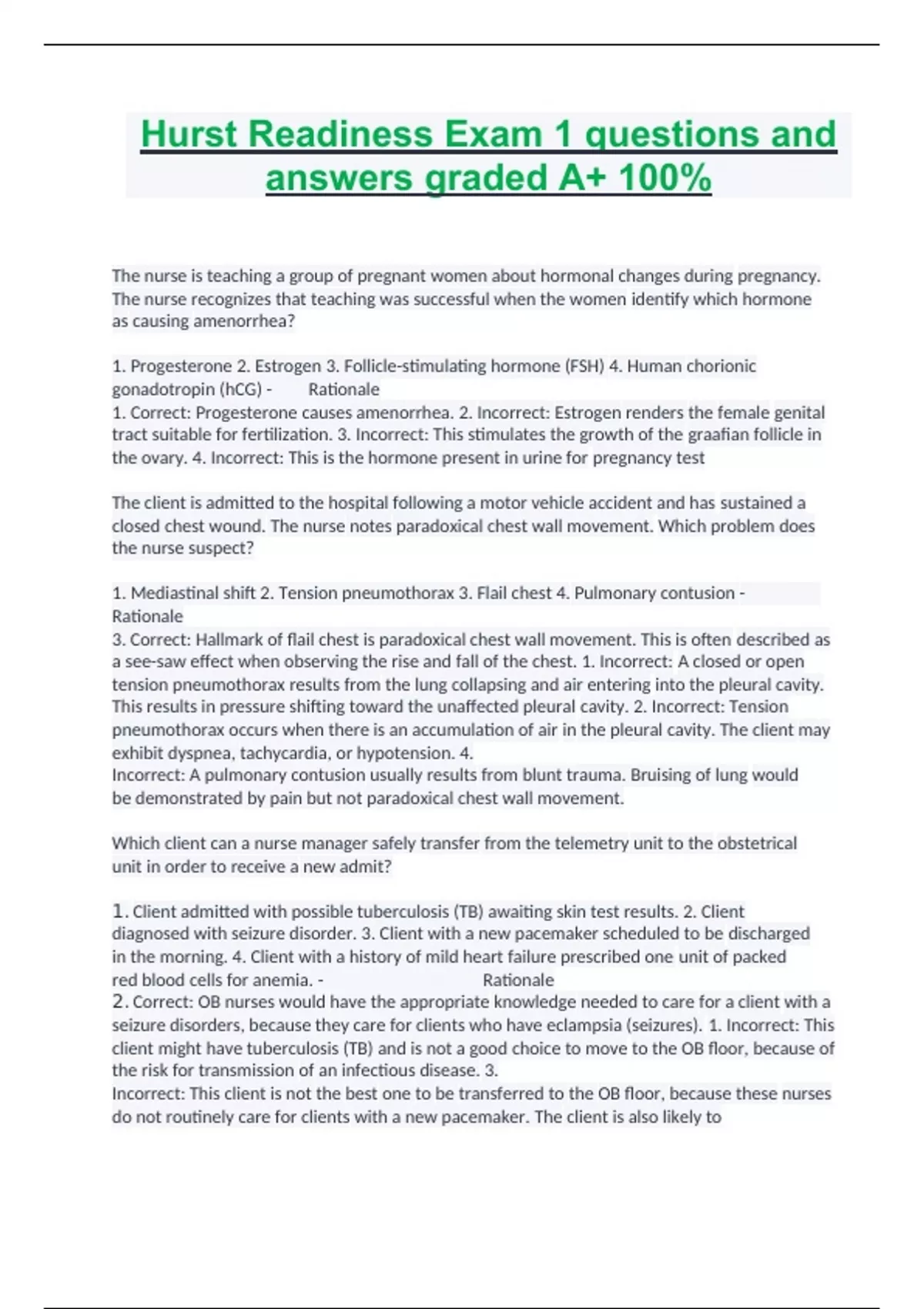 Hurst Readiness Exam 1 questions and answers graded A+ 100% The nurse is teaching a group of pregnant women about hormonal changes during pregnancy. The nurse recognizes that teaching was successful when the women identify which hormone as causing amenorrhea? 1. Progesterone 2. Estrogen 3. Follicle-stimulating hormone (FSH) 4. Human chorionic gonadotropin (hCG) - Rationale 1. Correct: Progesterone causes amenorrhea. 2. Incorrect: Estrogen renders the female genital tract suitable for fertilization. 3. Incorrect: This stimulates the growth of the graafian follicle in the ovary. 4. Incorrect: This is the hormone present in urine for pregnancy test