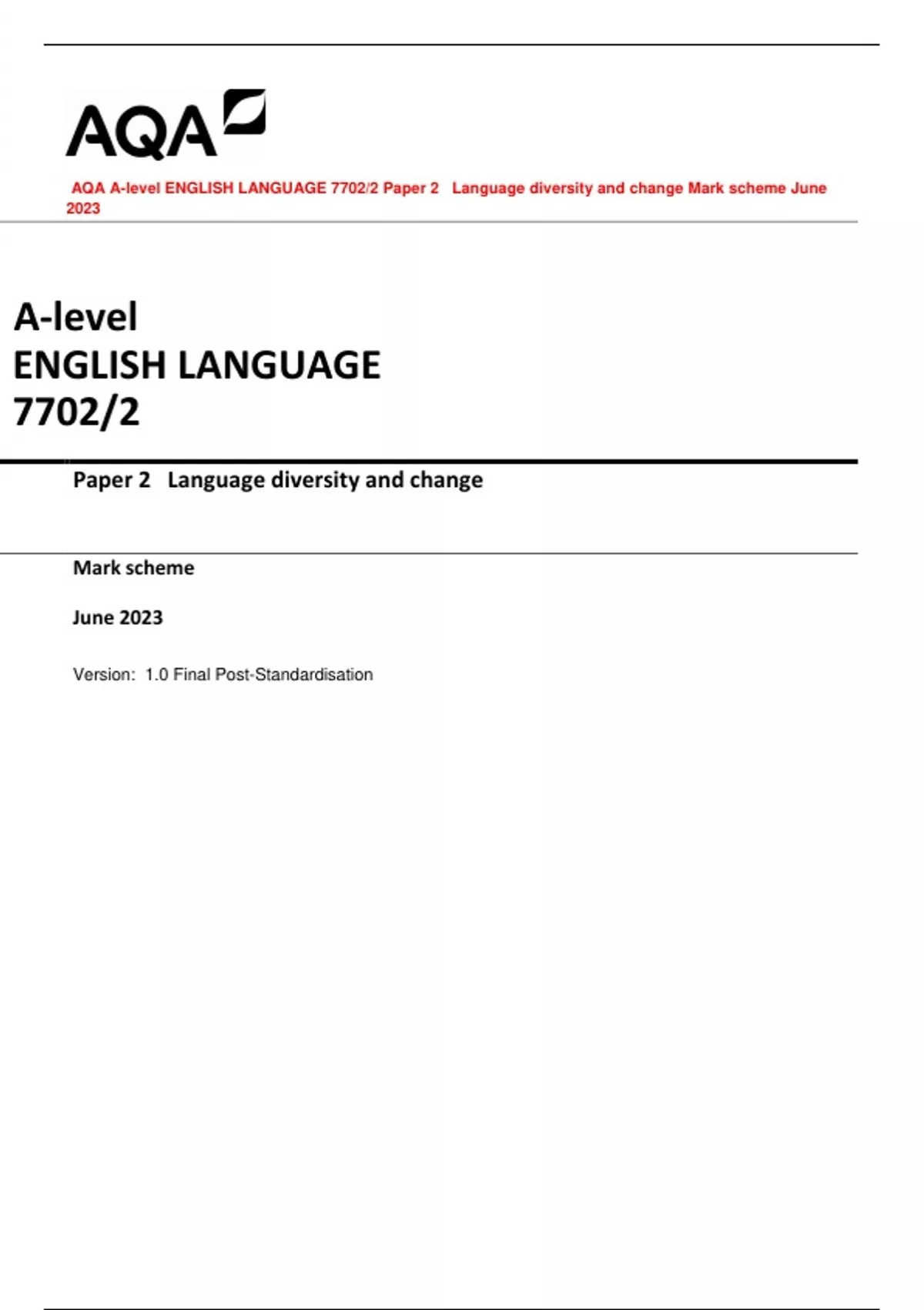 AQA A-level ENGLISH LANGUAGE 7702/2 Paper 2 Language diversity and change Mark scheme June 2023