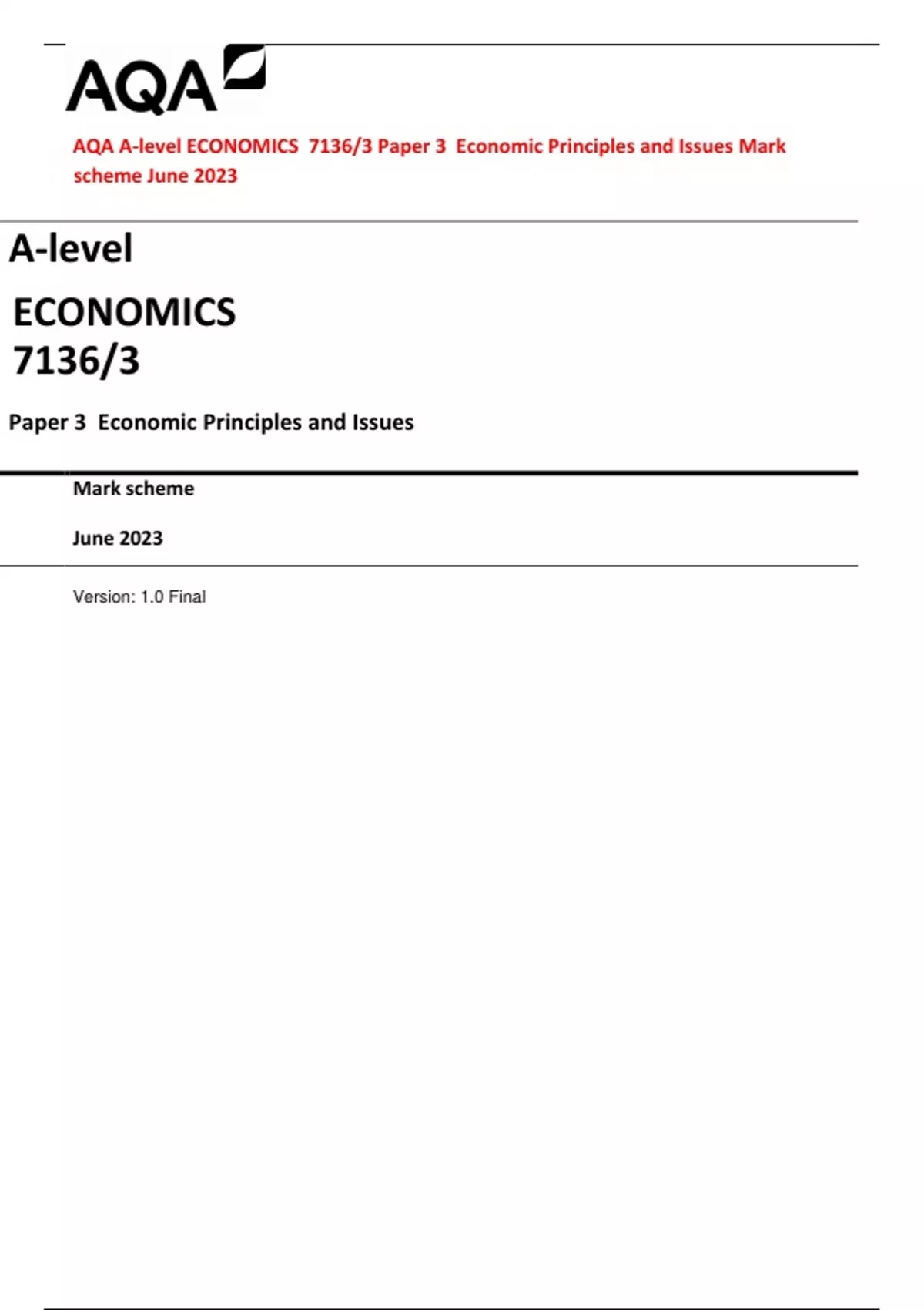 AQA A-level ECONOMICS 7136/3 Paper 3 Economic Principles and Issues Mark scheme June 2023