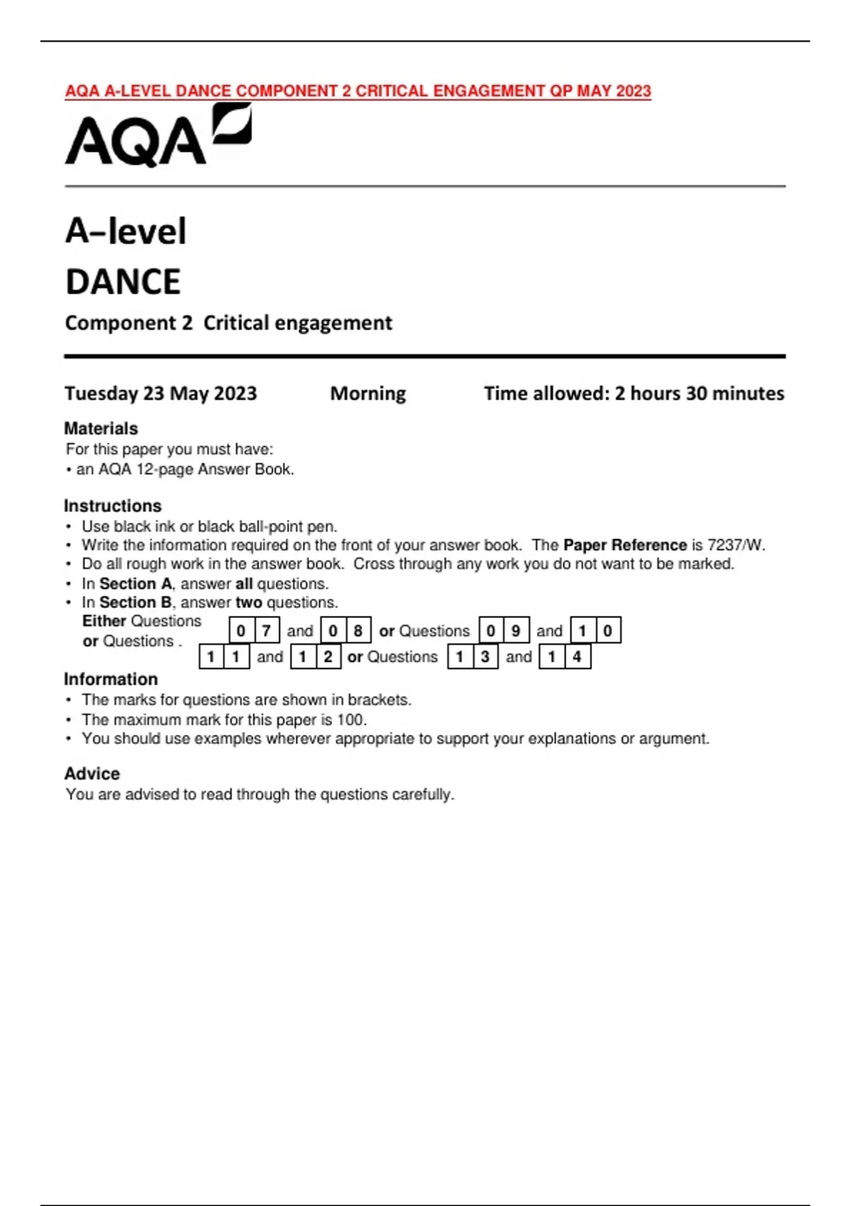 AQA A-LEVEL DANCE COMPONENT 2 CRITICAL ENGAGEMENT QP MAY 2023
