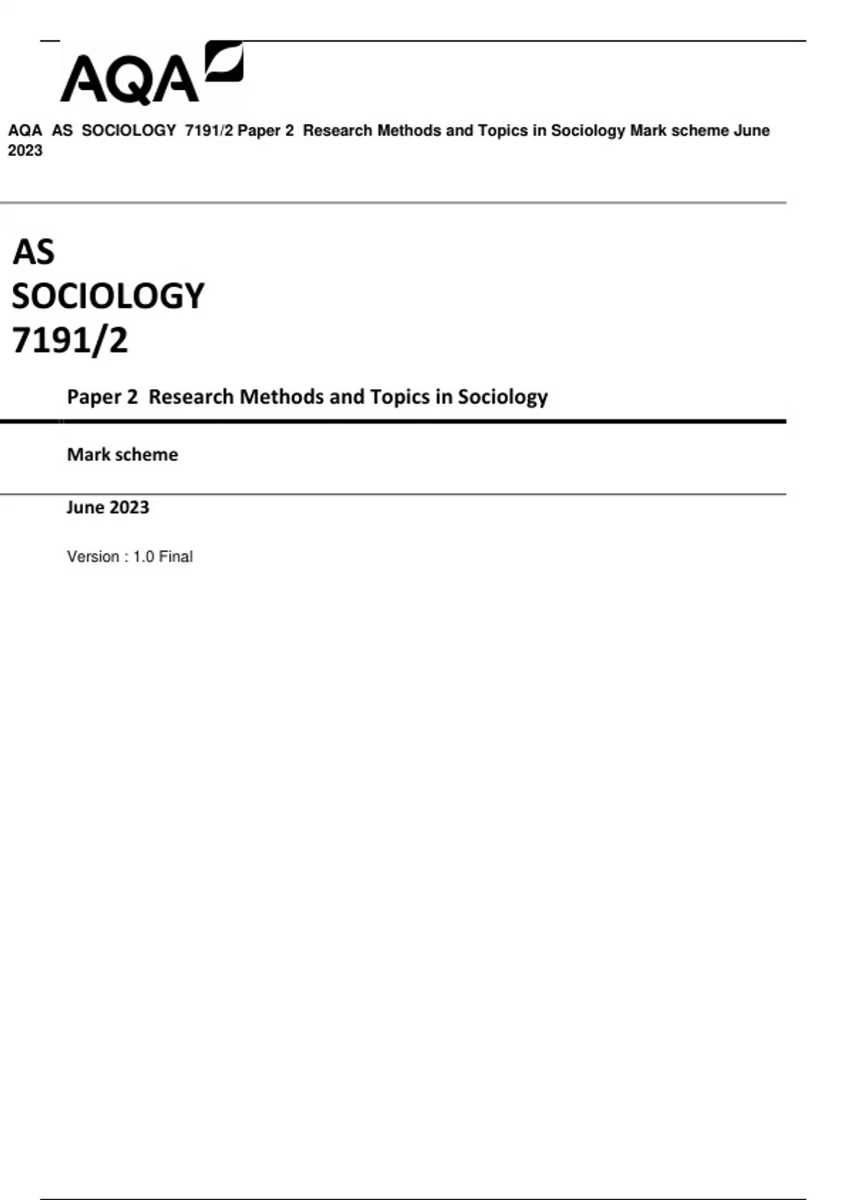 AQA AS SOCIOLOGY 7191/2 Paper 2 Research Methods and Topics in Sociology Mark scheme June 2023