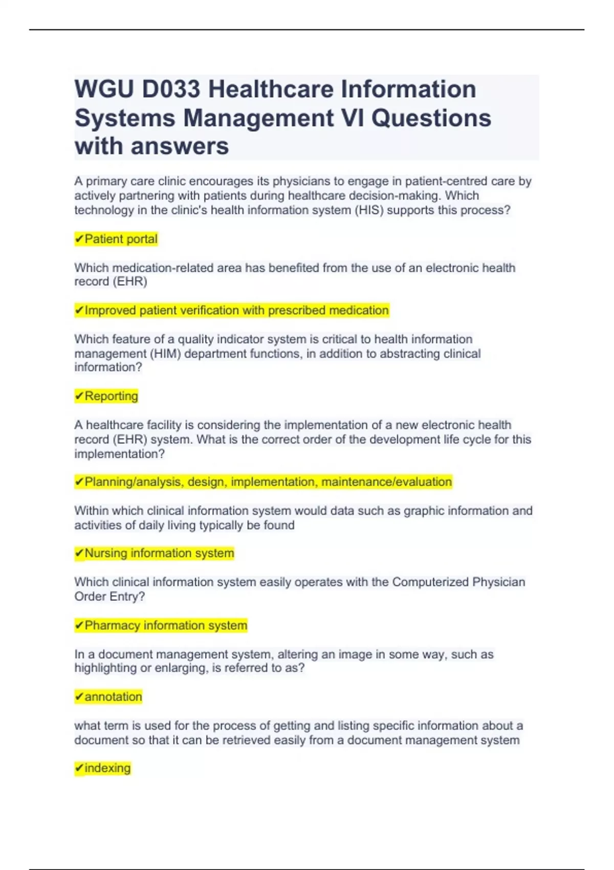 WGU D033 Healthcare Information Systems Management VI Questions with answers