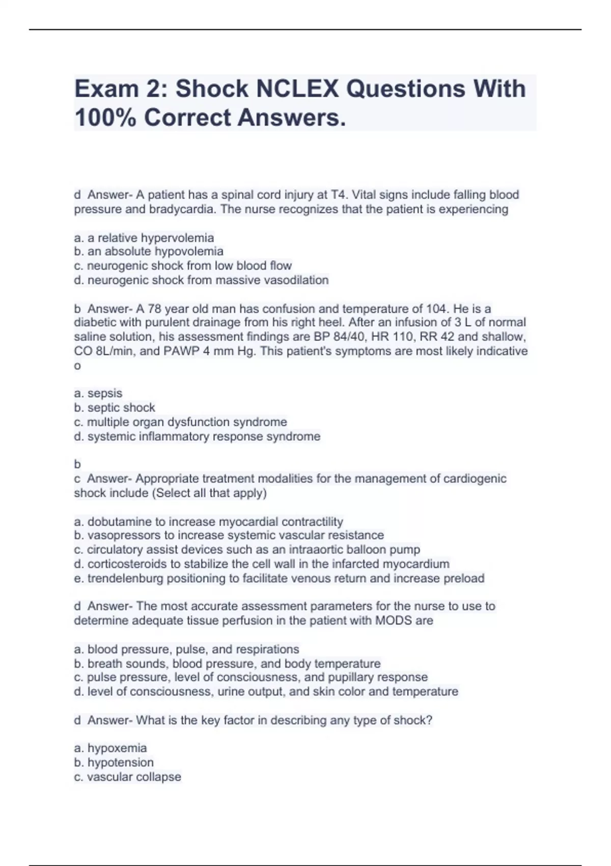 Exam 2: Shock NCLEX Questions With 100% Correct Answers.