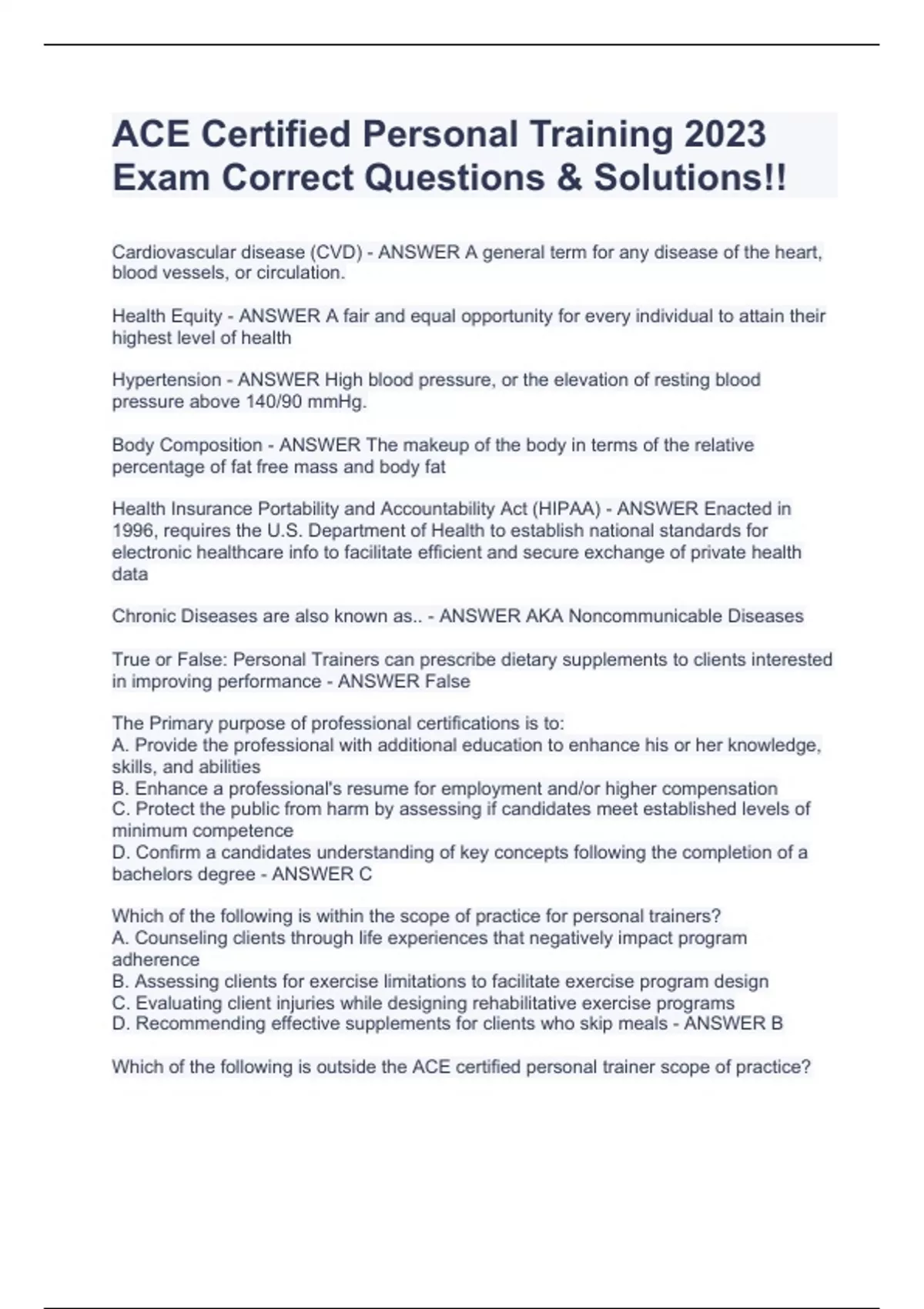 Cardiovascular disease (CVD) - ANSWER A general term for any disease of the heart, blood vessels, or circulation. Health Equity - ANSWER A fair and equal opportunity for every individual to attain their highest level of health Hypertension - ANSWER High blood pressure, or the elevation of resting blood pressure above 140/90 mmHg. Body Composition - ANSWER The makeup of the body in terms of the relative percentage of fat free mass and body fat Health Insurance Portability and Accountability Act (HIPAA) - ANSWER Enacted in 1996, requires the U.S. Department of Health to establish national standards for electronic healthcare info to facilitate efficient and secure exchange of private health data Chronic Diseases are also known as.. - ANSWER AKA Noncommunicable Diseases True or False: Personal Trainers can prescribe dietary supplements to clients interested in improving performance - ANSWER False The Primary purpose of professional certifications is to: A. Provide the professional with additional education to enhance his or her knowledge, skills, and abilities B. Enhance a professional's resume for employment and/or higher compensation C. Protect the public from harm by assessing if candidates meet established levels of minimum competence