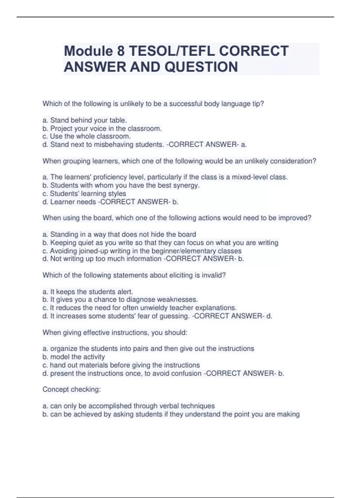 Module 8 TESOL/TEFL CORRECT ANSWER AND QUESTION Which of the following is unlikely to be a successful body language tip? a. Stand behind your table. b. Project your voice in the classroom. c. Use the whole classroom. d. Stand next to misbehaving students. -CORRECT ANSWER- a. When grouping learners, which one of the following would be an unlikely consideration? a. The learners' proficiency level, particularly if the class is a mixed-level class. b. Students with whom you have the best synergy. c. Students' learning styles d. Learner needs -CORRECT ANSWER- b. When using the board, which one of the following actions would need to be improved? a. Standing in a way that does not hide the board b. Keeping quiet as you write so that they can focus on what you are writing c. Avoiding joined-up writing in the beginner/elementary classes d. Not writing up too much information -CORRECT ANSWER- b. Which of the following statements about eliciting is invalid? a. It keeps the students alert. b. It gives you a chance to diagnose weaknesses. c. It reduces the need for often unwieldy teacher explanations. d. It increases some students' fear of guessing. -CORRECT ANSWER- d. When giving effective instructions, you should: a. organize the students into pairs and then give out the instructions b. model the activity c. hand out materials before giving the instructions d. present the instructions once, to avoid confusion -CORRECT ANSWER- b. Concept checking: a. can only be accomplished through verbal techniques b. can be achieved by asking students if they understand the point you are making c. should be restricted to checking vocabulary d. should not use the target language within the question -CORRECT ANSWER- d. Feedback: a. is always verbal b. focuses fully on learners' language or skills c. is always given to individuals, not groups d. motivates learners when they are doing well -CORRECT ANSWER- d. Constructive feedback means only giving positive feedback. True or False? -CORRECT ANSWER- False In relation to giving constructive feedback, which of the following is invalid? a. Refer to behavior that can be changed. b. Be evaluative rather than descriptive. c. You need to own the feedback. d. Try to be specific. -CORRECT ANSWER- b. When correcting writing, try to mark everything. True or False? -CORRECT ANSWERFalse When an assessment measures what it is supposed to measure, it is: a. fair b. reliable c. valid d. sufficient -CORRECT ANSWER- c. Always be aware that in the EFL/ESOL classroom effective communication with an appropriate response is often more important than grammatical accuracy. True or False? -CORRECT ANSWER- True One of the primary aims of standardization is, where possible, to improve: a. flexibility b. practicability c. reliability d. results -CORRECT ANSWER- c. In the assessment arena: a. summative assessment is a more informal type of assessment b. summative assessment can reflect and evaluate the efficiency of learning in its process c. formative assessment is a more formal type of assessment d. formative assessment can reflect and evaluate the efficiency of learning in its process -CORRECT ANSWER- d. Which of the following is unlikely to be regarded as summative assessment activity? a. You dictate a passage and the learners write down a set of words. b. You give the learners a sentence and they rewrite it, incorporating a change of expression but preserving the basic meaning. c. You get feedback from your learners about their learning. d. You omit words from a passage and your learners have to choose, from a list, the correct words to fill the gaps. -CORRECT ANSWER- c