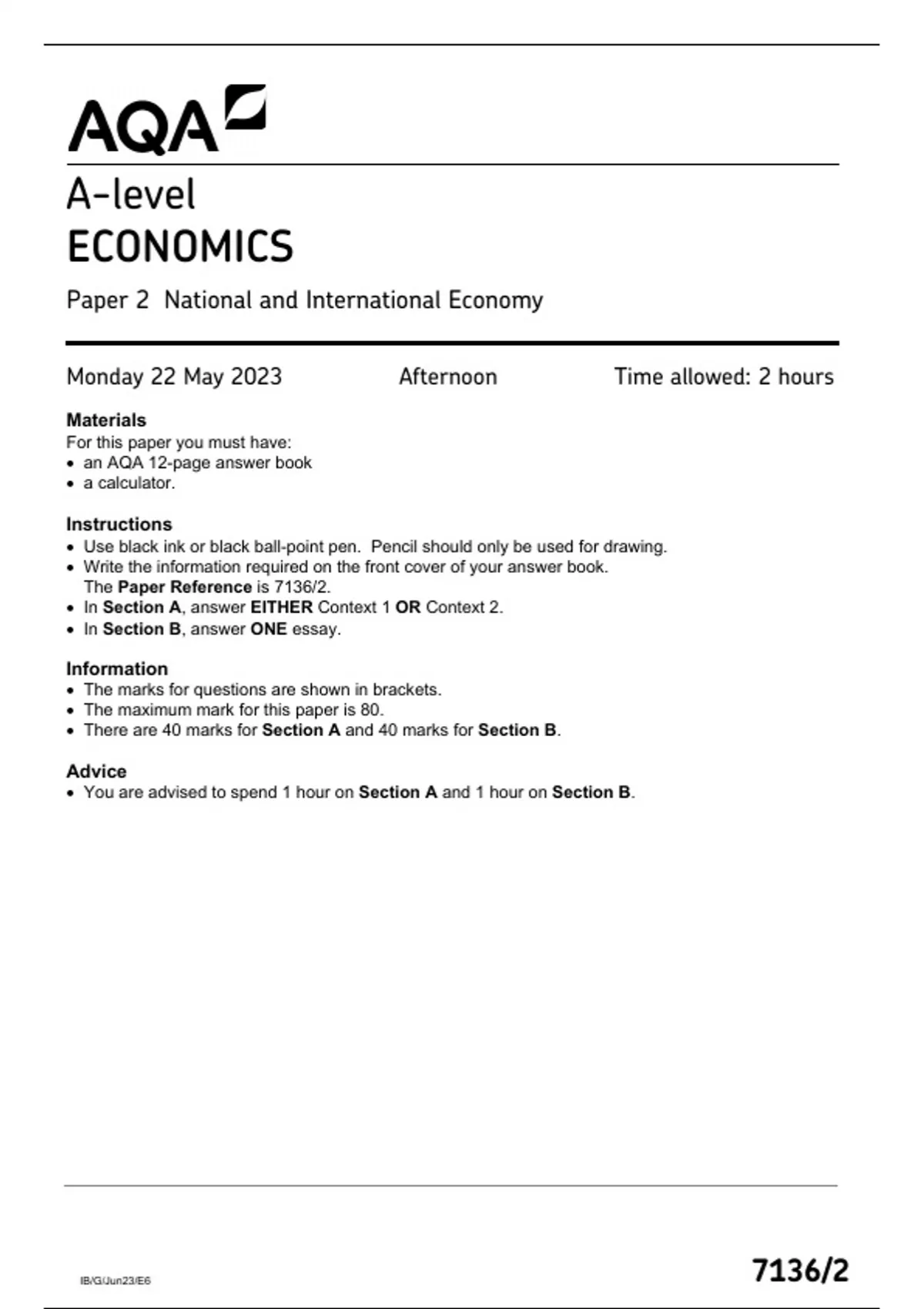 AQA A LEVEL ECONOMICS PAPER 2 QUESTION PAPER MAY 2023 (7136-2: National and International Economy)