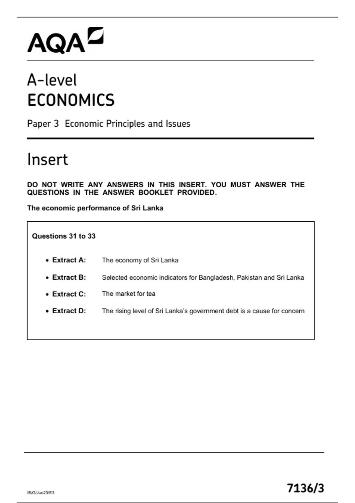 AQA A LEVEL ECONOMICS PAPER 3 INSERT 2023 (7136-3: