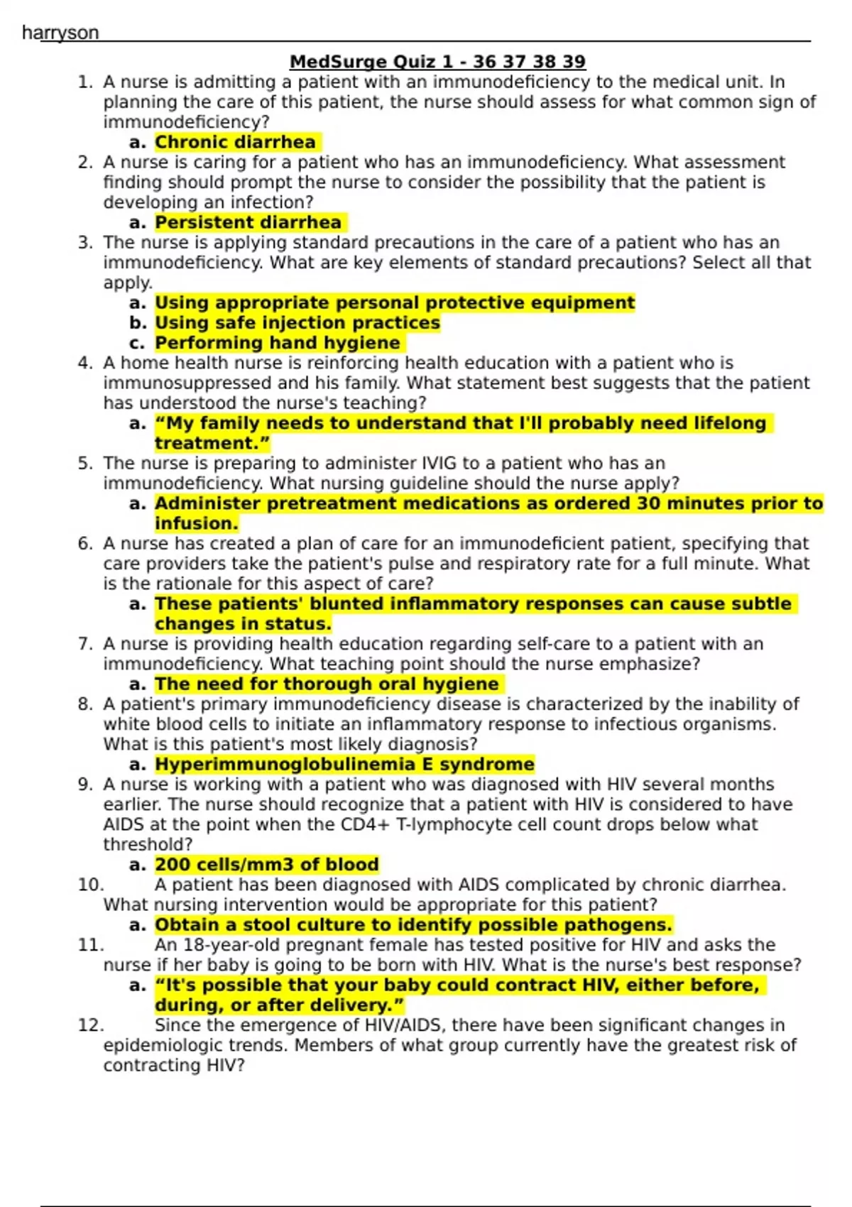 All med surge exams and quizzes docx. A nurse is admitting a patient with an immunodeficiency to the medical unit. In planning the care of this patient, the nurse should assess for what common sign of immunodeficiency? a. Chronic diarrhea 2. A nurse is caring for a patient who has an immunodeficiency. What assessment finding should prompt the nurse to consider the possibility that the patient is developing an infection? a. Persistent diarrhea 3. The nurse is applying standard precautions in the care of a patient who has an immunodeficiency. What are key elements of standard precautions? Select all that apply. a. Using appropriate personal protective equipment b. Using safe injection practices c. Performing hand hygiene 4. A home health nurse is reinforcing health education with a patient who is immunosuppressed and his family. What statement best suggests that the patient has understood the nurse's teaching? a. “My family needs to understand that I'll probably need lifelong treatment.” 5. The nurse is preparing to administer IVIG to a patient who has an immunodeficiency. What nursing guideline should the nurse apply? a. Administer pretreatment medications as ordered 30 minutes prior to infusion. 6. A nurse has created a plan of care for an immunodeficient patient, specifying that care providers take the patient's pulse and respiratory rate for a full minute. What is the rationale for this aspect of care? a. These patients' blunted inflammatory responses can cause subtle changes in status. 7. A nurse is providing health education regarding self-care to a patient with an immunodeficiency. What teaching point should the nurse emphasize? a. The need for thorough oral hygiene 8. A patient's primary immunodeficiency disease is characterized by the inability of white blood cells to initiate an inflammatory response to infectious organisms. What is this patient's most likely diagnosis? a. Hyperimmunoglobulinemia E syndrome 9. A nurse is working with a patient who was diagnosed with HIV several months earlier. The nurse should recognize that a patient with HIV is considered to have AIDS at the point when the CD4+ T-lymphocyte cell count drops below what threshold? a. 200 cells/mm3 of blood 10. A patient has been diagnosed with AIDS complicated by chronic diarrhea. What nursing intervention would be appropriate for this patient? a. Obtain a stool culture to identify possible pathogens. 11. An 18-year-old pregnant female has tested positive for HIV and asks the nurse if her baby is going to be born with HIV. What is the nurse's best response? a. “It's possible that your baby could contract HIV, either before, during, or after delivery.” 12. Since the emergence of HIV/AIDS, there have been significant changes in epidemiologic trends. Members of what group currently have the greatest risk of contracting HIV? harryson a. Gay, bisexual, and other men who have sex with men 13. A hospital patient is immunocompromised because of stage 3 HIV infection and the physician has ordered a chest radiograph. How should the nurse most safely facilitate the test? a. Arrange for a portable x-ray machine to be used 14. A patient's current antiretroviral regimen includes nucleoside reverse transcriptase inhibitors (NRTIs). What dietary counseling will the nurse provide based on the patient's medication regimen? a. Take this medication without regard to meals. 15. A nurse is performing the admission assessment of a patient who has AIDS. What components should the nurse include in this comprehensive assessment? Select all that apply. a. Current medication regimen b. Identification of patient's support system c. Immune system function d. History of sexual practices 16. A patient is in the primary infection stage of HIV. What is true of this patient's current health status? a. The patient is infected with HIV but lacks HIV-specific antibodies. 17. A nurse is aware of the need to assess patients' risks for anaphylaxis. What health care procedure constitutes the highest risk for anaphylaxis? a. Computed tomography with contrast solution 18. A patient with multiple food and environmental allergies tells the nurse that he is frustrated and angry about having to be so watchful all the time and wonders if it is really worth it. What would be the nurse's best response? a. “I can only imagine how you feel. Would you like to talk about it? 19. A nurse is caring for a patient who has allergic rhinitis. What intervention would be most likely to help the patient meet the goal of improved breathing pattern? a. Modify the environment to reduce the severity of allergic symptoms. 20. The nurse in an allergy clinic is educating a new patient about the pathology of the patient's health problem. What response should the nurse describe as a possible consequence of histamine release? a. Contraction of bronchial smooth muscle 21. A patient has presented with signs and symptoms that are consistent with contact dermatitis. What aspect of care should the nurse prioritize when working with this patient? a. Identifying the offending agent, if possible 22. A patient's rheumatoid arthritis (RA) has failed to respond appreciably to first-line treatments and the primary care provider has added prednisone to the patient's drug regimen. What principle will guide this aspect of the patient's treatment? a. The drug should be used for as short a time as possible. 23. A patient with SLE has come to the clinic for a routine check-up. When auscultating the patient's apical heart rate, the nurse notes the presence of a distinct “scratching” sound. What is the nurse's most appropriate action? a. Inform the primary care provider that a friction rub may be present. 24. A nurse is educating a patient with gout about lifestyle modifications that can help control the signs and symptoms of the disease. What recommendation should the nurse make? a. Limiting intake of alcohol