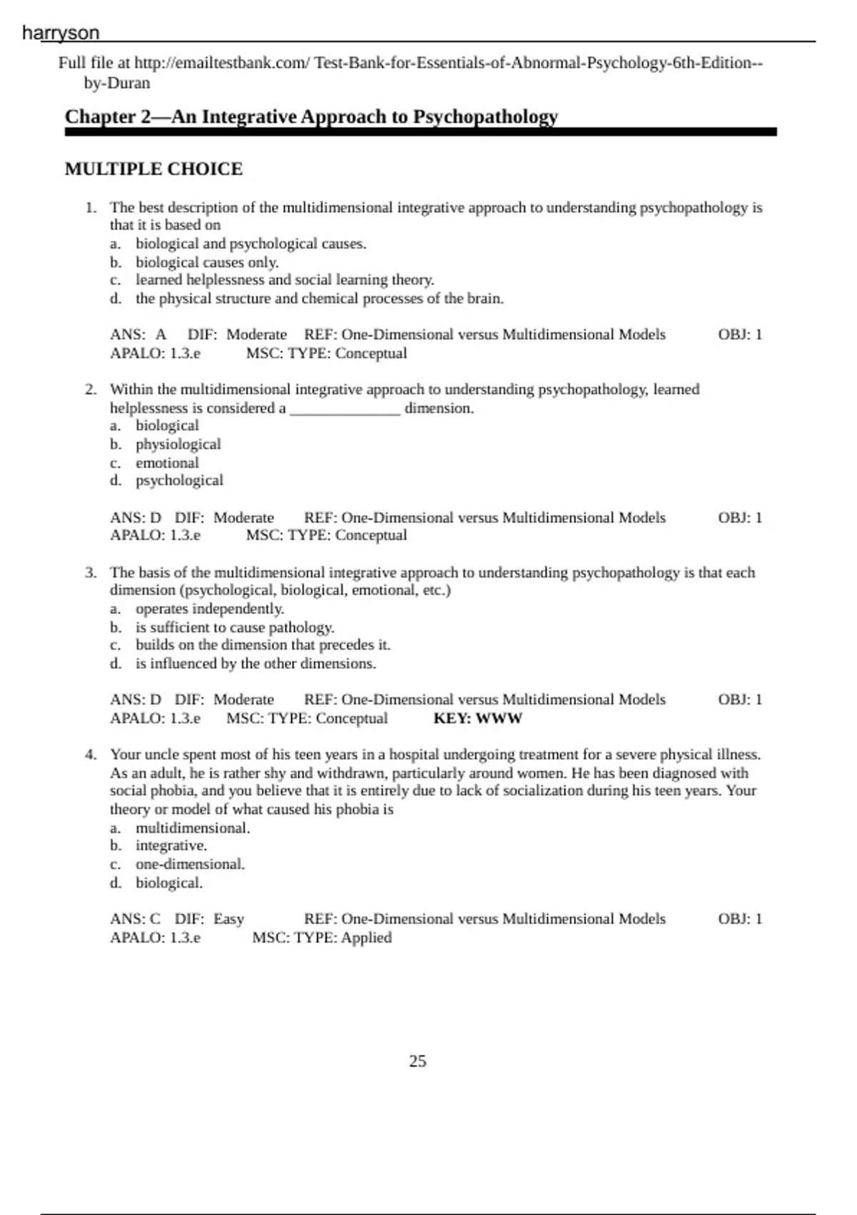 Test Bank for Essentials of Abnormal Psychology 6th Edition by Durand DOC Full file at by-Duran Chapter 2—An Integrative Approach to Psychopathology MULTIPLE CHOICE 1. The best description of the multidimensional integrative approach to understanding psychopathology is that it is based on a. biological and psychological causes. b. biological causes only. c. learned helplessness and social learning theory. d. the physical structure and chemical processes of the brain. ANS: A DIF: Moderate REF: One-Dimensional versus Multidimensional Models OBJ: 1 APALO: 1.3.e MSC: TYPE: Conceptual 2. Within the multidimensional integrative approach to understanding psychopathology, learned helplessness is considered a ______________ dimension. a. biological b. physiological c. emotional d. psychological ANS: D DIF: Moderate REF: One-Dimensional versus Multidimensional Models OBJ: 1 APALO: 1.3.e MSC: TYPE: Conceptual 3. The basis of the multidimensional integrative approach to understanding psychopathology is that each dimension (psychological, biological, emotional, etc.) a. operates independently. b. is sufficient to cause pathology. c. builds on the dimension that precedes it. d. is influenced by the other dimensions. ANS: D DIF: Moderate REF: One-Dimensional versus Multidimensional Models OBJ: 1 APALO: 1.3.e MSC: TYPE: Conceptual KEY: WWW 4. Your uncle spent most of his teen years in a hospital undergoing treatment for a severe physical illness. As an adult, he is rather shy and withdrawn, particularly around women. He has been diagnosed with social phobia, and you believe that it is entirely due to lack of socialization during his teen years. Your theory or model of what caused his phobia is a. multidimensional. b. integrative. c. one-dimensional. d. biological. ANS: C DIF: Easy REF: One-Dimensional versus Multidimensional Models OBJ: 1 APALO: 1.3.e MSC: TYPE: Applied 25 harryson 5. Amanda is 12 years old, and her sister Samantha is five. While riding in a car with their parents, the girls witness a major automobile accident where a number of people are injured. The girls react very differently to the accident. This is probably due to a. biological differences. b. developmental differences. c. psychological differences. d. sociocultural differences. ANS: BDIF: Moderate REF: One-Dimensional versus Multidimensional Models OBJ: 1 APALO: 1.2.a(4) MSC: TYPE: Applied NOT: NEW 6. One of the problems with adopting a one-dimensional biological causal model of abnormality is a. it ignores the contributions of psychological and sociocultural factors to the disorder. b. it ignores the contributions of psychological and sociocultural factors to the disorder. c. it ignores any environmental influences on the disorder. d. all of these ANS: D DIF: Easy REF: One-Dimensional versus Multidimensional Models OBJ: 1 APALO: 1.3.e MSC: TYPE: Conceptual NOT: NEW 7. The most accurate way to think of genes is that they a. set boundaries for our development. b. determine both our physical and psychological characteristics. c. determine physical but not psychological characteristics. d. actually have very little to do with any of the characteristics that we display. ANS: A DIF: Moderate REF: Genetic Contributions to Psychopathology OBJ: 2 APALO: 1.2.a(3) MSC: TYPE: Conceptual 8. Many factors that determine whether genes are “turned on” are in the environment in the form of a. social influences. b. parental influences. c. cultural influences. d. social and cultural influences. ANS: D DIF: Moderate REF: Genetic Contributions to Psychopathology OBJ: 2 APALO: 1.2.a(3) MSC: TYPE: Factual 9. Most psychological disorders appear to be influenced by many individual genes rather than caused by one single gene, a type of influence referred to as a. multigenic. b. polygenic. c. unigenic. d. morphogenic. ANS: B DIF: Moderate REF: Genetic Contributions to Psychopathology OBJ: 2 APALO: 1.2.a(3) MSC: TYPE: Factual KEY: WWW 26
