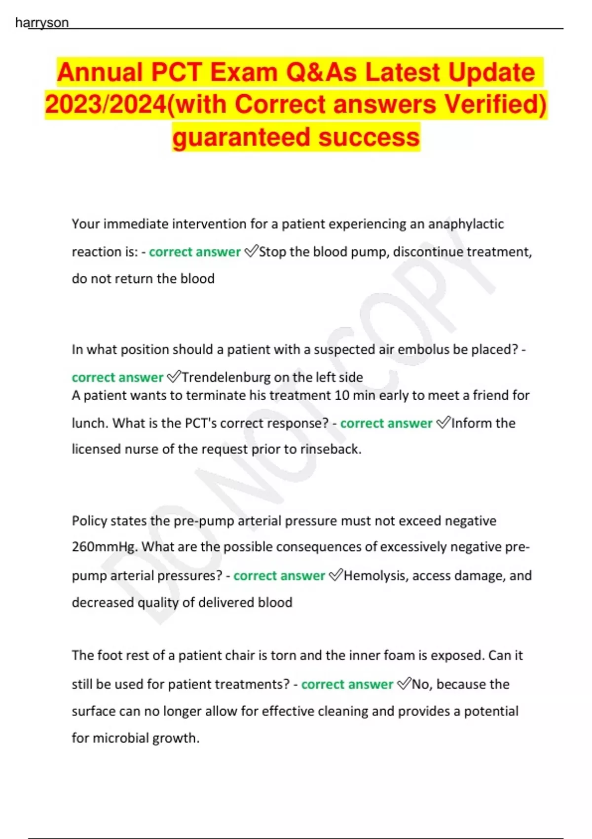 Stuvia 2668011 annual pct exam q en as latest update with correct answers verified guaranteed successAnnual PCT Exam Q&As Latest Update 2023/2024(with Correct answers Verified) guaranteed success Your immediate intervention for a patient experiencing an anaphylactic reaction is: - correct answer Stop the blood pump, discontinue treatment, do not return the blood In what position should a patient with a suspected air embolus be placed? - correct answer Trendelenburg on the leftside A patient wants to terminate his treatment 10 min early to meet a friend for lunch. What is the PCT's correct response? - correct answer Inform the licensed nurse of the request prior to rinseback. Policy states the pre-pump arterial pressure must not exceed negative 260mmHg. What are the possible consequences of excessively negative prepump arterial pressures? - correct answer Hemolysis, access damage, and decreased quality of delivered blood The foot rest of a patient chair is torn and the inner foam is exposed. Can it still be used for patient treatments? - correct answer No, because the surface can no longer allow for effective cleaning and provides a potential for microbial growth. harryson Annual PCT Exam Q&As Latest Update 2023/2024(with Correct answers Verified) guaranteed success After you initiated your patient's rinseback, you notice you forgot to bring a glove for the patient to wear when holding his needle sites. Whatshould you do? - correct answer Complete the rinseback procedure, then go and get the glove. What needle size should be used for a new AVF with a BFR (blood pump speed) prescription of 250 - 350 ml/min? - correct answer 16 gauge Your patient is complaining of cramps and you have already administered 100ml of saline bolus, but the patient is still cramping. What is NOT an Annual PCT Exam Q&As Latest Update 2023/2024(with Correct answers Verified) guaranteed success harryson Annual PCT Exam Q&As Latest Update 2023/2024(with Correct answers Verified) guaranteed success acceptable intervention? - correct answer Applying a glove filled with hot water You entered the patient's dialysate orders into the machine and connected to the proper dialysate concentrates. When should you perform the independent conductivity and pH reading? - correct answer During priming after allowing the conductivity to stabilize and before connecting the Hansens to the dialyzer Your patient's calculated UF Goal exceeds the maximum UFR ordered by the nephrologist. What is the correct response in the regards to fluid removal? - correct answer The calculated UF Goal must be adjusted to not exceed the ordered maximum UFR and the reason documented. Proper functioning of the independent meters to check dialysate conductivity and pH must be verified: - correct answer Prior to daily use If bicarbonate is mixed for too long, CO2 is released from the solution as a result of over-mixing. Would you notice this when performing the