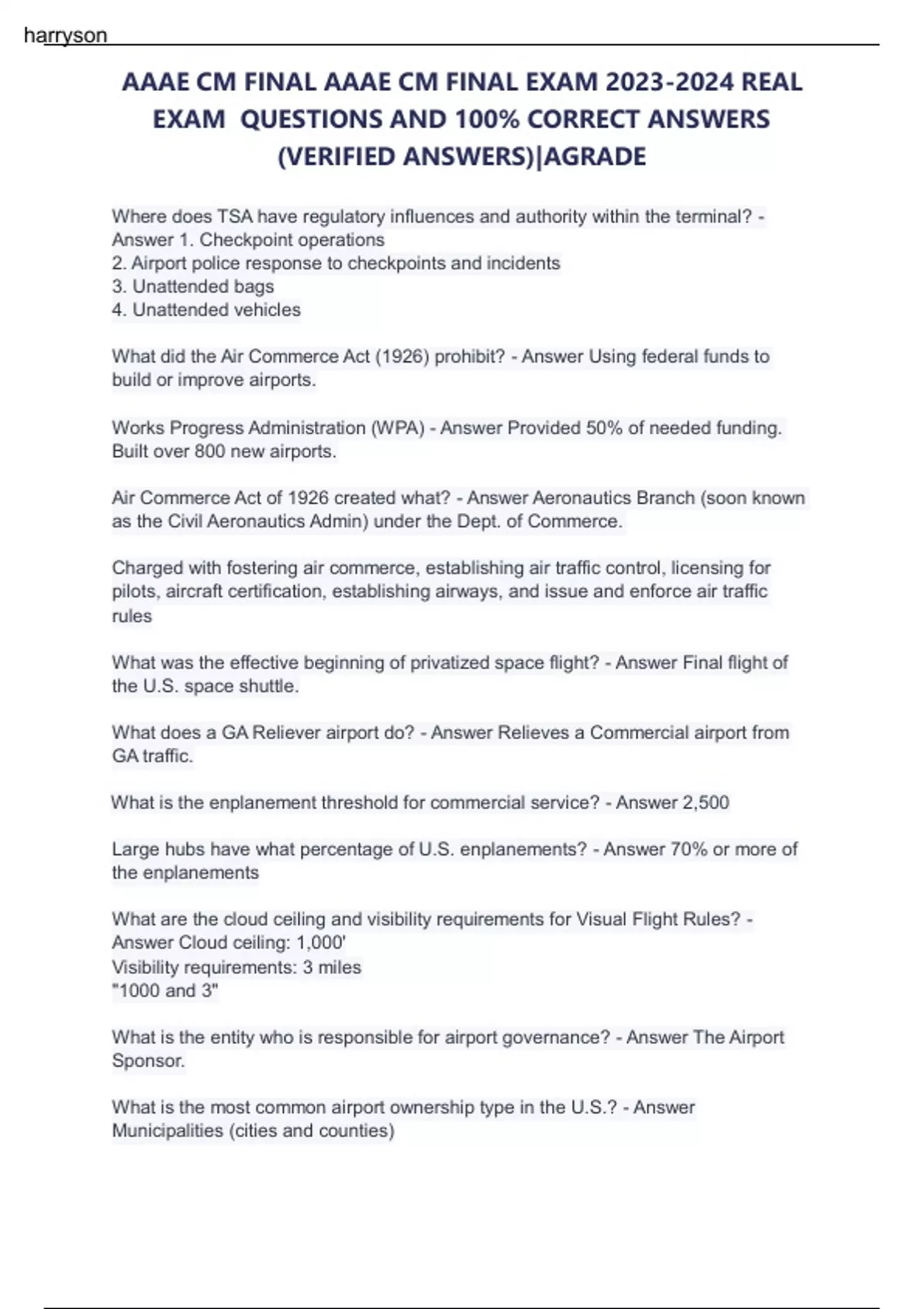 Aaae cm final aaae cm final exam real examAAAE CM FINAL AAAE CM FINAL EXAM REAL EXAM QUESTIONS AND 100% CORRECT ANSWERS (VERIFIED ANSWERS)|AGRADE Where does TSA have regulatory influences and authority within the terminal? - Answer 1. Checkpoint operations 2. Airport police response to checkpoints and incidents 3. Unattended bags 4. Unattended vehicles What did the Air Commerce Act (1926) prohibit? - Answer Using federal funds to build or improve airports. Works Progress Administration (WPA) - Answer Provided 50% of needed funding. Built over 800 new airports. Air Commerce Act of 1926 created what? - Answer Aeronautics Branch (soon known as the Civil Aeronautics Admin) under the Dept. of Commerce. Charged with fostering air commerce, establishing air traffic control, licensing for pilots, aircraft certification, establishing airways, and issue and enforce air traffic rules What was the effective beginning of privatized space flight? - Answer Final flight of the U.S. space shuttle. What does a GA Reliever airport do? - Answer Relieves a Commercial airport from GA traffic. What is the enplanement threshold for commercial service? - Answer 2,500 Large hubs have what percentage of U.S. enplanements? - Answer 70% or more of the enplanements What are the cloud ceiling and visibility requirements for Visual Flight Rules? - Answer Cloud ceiling: 1,000' Visibility requirements: 3 miles "1000 and 3" What is the entity who is responsible for airport governance? - Answer The Airport Sponsor. What is the most common airport ownership type in the U.S.? - Answer Municipalities (cities and counties) harryson AAAE CM FINAL AAAE CM FINAL EXAM REAL EXAM QUESTIONS AND 100% CORRECT ANSWERS (VERIFIED ANSWERS)|AGRADE Who sets standards for security access control systems? - Answer The Radio Technical Commission on Aeronautics How many days are required for the Notice of Proposed Rule-Making? - Answer 30 days What is the directive to FAA personnel on specific subjects and programs? - Answer The FAA Order What is the method the FAA has found to be the best to extend federal policy to local government units? - Answer Grant Assurances What is 14 CFR Part 13 Investigation and Enforcement - Answer The informal complaint system that is filed with the Airport District Office. FAA will investigate and offer to help resolve. If the sponsor is in violation, the FAA provides the opportunity to comply. A Notice of Noncompliance may be issued if the FAA believes the airport is noncompliant. The letter will identify the apparent violation(s), specifies corrective action(s), and gives a deadline. What is 14 CFR Part 16 Rules of Practice for Federally-Assisted Airport Enforcement Proceedings - Answer The formal complaint system that is filed in Washington DC. It involves financial compliance and reasonable and nondiscriminatory access, but includes all obligations in the Grant Assurances and property deeds. Formal agency finding regarding the compliance status of an airport. Prior to a Part 16 complaint, a person must have initiated and engaged in good faith efforts to resolve informally (Part 13 will work). Deadline driven, including pleadings, investigations, and lawyers If airport is non-compliant, FAA may withhold new grants, withhold payment on existing grants, terminate eligibility for future grants and passenger facility charges; cease and desist orders; civil penalties; or judicial enforcement. What does the Tucker Act do? - Answer Waives immunity over claims arising out of contracts with the federal government. What agency has the power to make safety related regulations after an aircraft accident? - Answer The FAA Who produces standards and recommended practices for aviation worldwide? - Answer The International Civil Aviation Organization (ICAO) What professional industry trade organization represents GA pilots of small aircraft?