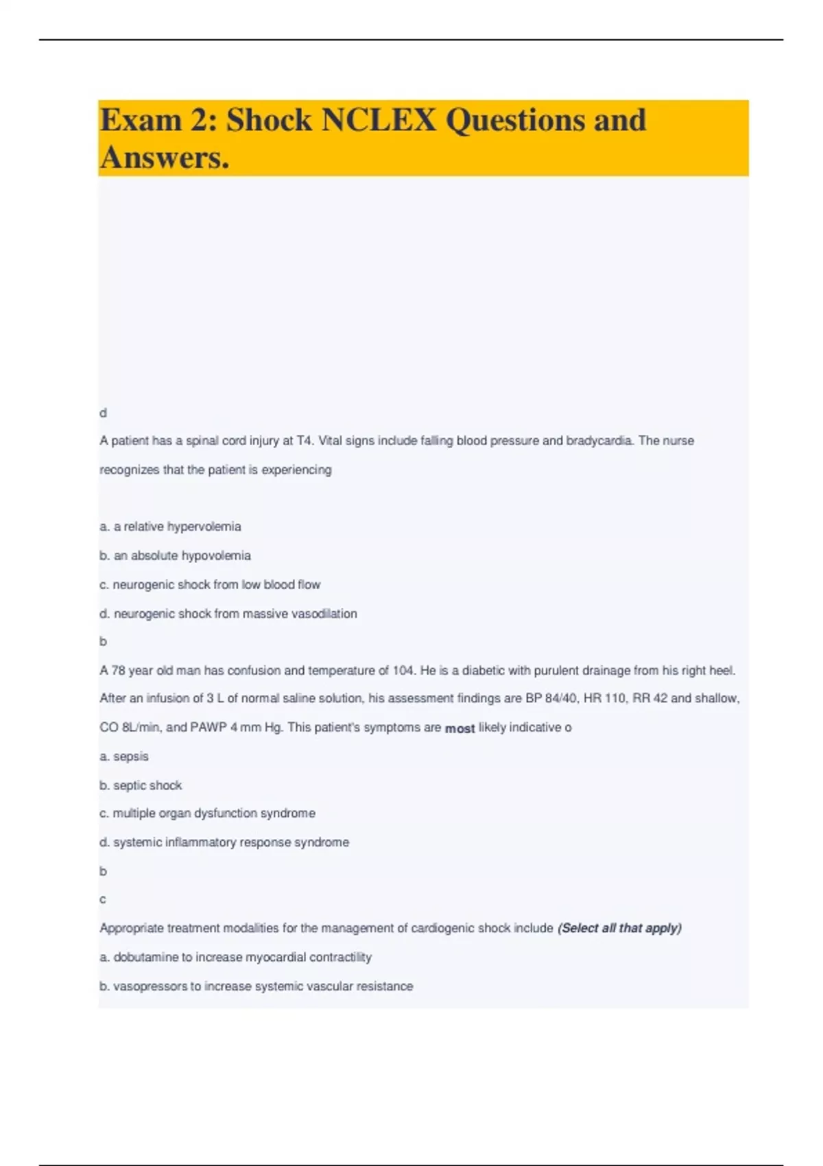Exam 2: Shock NCLEX Questions and Answers.