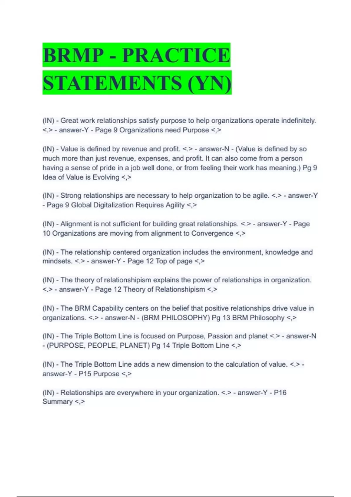 BRMP - PRACTICE STATEMENTS (YN) With Correct answers 2023 (IN) - Great work relationships satisfy purpose to help organizations operate indefinitely. <.> - answer-Y - Page 9 Organizations need Purpose <,> (IN) - Value is defined by revenue and profit. <.> - answer-N - (Value is defined by so much more than just revenue, expenses, and profit. It can also come from a person having a sense of pride in a job well done, or from feeling their work has meaning.) Pg 9 Idea of Value is Evolving <,> (IN) - Strong relationships are necessary to help organization to be agile. <.> - answer-Y - Page 9 Global Digitalization Requires Agility <,> (IN) - Alignment is not sufficient for building great relationships. <.> - answer-Y - Page 10 Organizations are moving from alignment to Convergence <,>