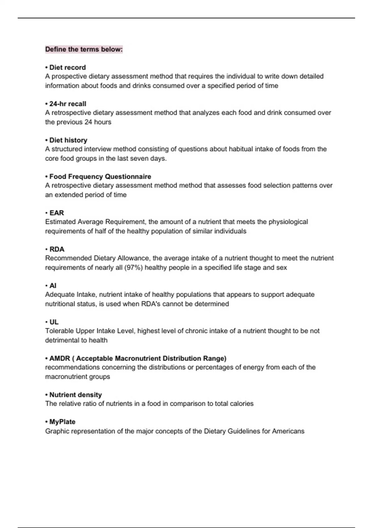 This is the HUN1201 Midterm Study guide for College of Central Florida human nutrition. It has all the definitions you need to know, practice questions, and kcalorie calculation examples.