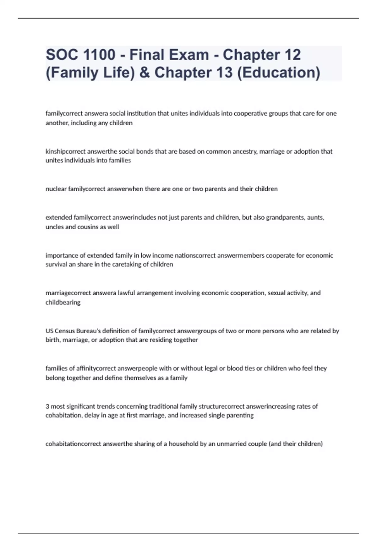 SOC 1100 - Final Exam - Chapter 12 (Family Life) & Chapter 13 (Education)-correctly solved