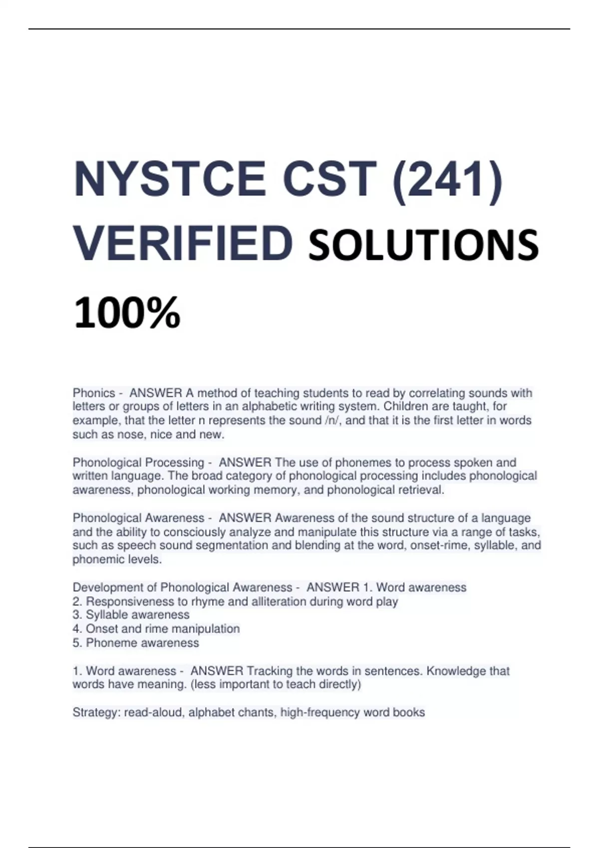 NYSTCE CST (241) VERIFIED SOLUTIONS 100% Phonics - ANSWER A method of teaching students to read by correlating sounds with letters or groups of letters in an alphabetic writing system. Children are taught, for example, that the letter n represents the sound /n/, and that it is the first letter in words such as nose, nice and new. Phonological Processing - ANSWER The use of phonemes to process spoken and written language. The broad category of phonological processing includes phonological awareness, phonological working memory, and phonological retrieval. Phonological Awareness - ANSWER Awareness of the sound structure of a language and the ability to consciously analyze and manipulate this structure via a range of tasks, such as speech sound segmentation and blending at the word, onset-rime, syllable, and phonemic levels. Development of Phonological Awareness - ANSWER 1. Word awareness 2. Responsiveness to rhyme and alliteration during word play 3. Syllable awareness 4. Onset and rime manipulation 5. Phoneme awareness 1. Word awareness - ANSWER Tracking the words in sentences. Knowledge that words have meaning. (less important to teach directly) Strategy: read-aloud, alphabet chants, high-frequency word books 2. Responsiveness to rhyme and alliteration during word play - ANSWER Enjoying and reciting learned rhyming words or alliterative phrases in familiar storybooks or nursery rhymes. Strategy: poetry books, alphabet chants, picture flashcards w/ objects whose names rhyme. (Flashcards can be used in sorting and classifying activities.) 3. Syllable awareness - ANSWER Counting, tapping, blending, or segmenting a word into syllables. Strategy: Flashcards w/ objects whose names contain different numbers of syllables. (Flashcards can be used in sorting activity.) 4. Onset and rime manipulation - ANSWER Onset is the initial consonant in a onesyllable word. Rime includes the remaining sounds, including the vowel and any sounds that follow. The ability to produce a rhyming word depends on understanding that rhyming words have the same rime. Recognizing a rhyme is much easier than producing a rhyme. Strategy: Blending and substitution activities. 5. Phonemic awareness - ANSWER This is the student's awareness of the smallest units of sound in a word. It also refers to a student's ability to segment, blend, and manipulate these units. - Identify and match the initial sounds in words, then the final and middle sounds (e.g., "Which picture begins with /m/?"; "Find another picture that ends in /r/"). - Segment and produce the initial sound, then the final and middle sounds (e.g., "What sound does zoo start with?"; "Say the last sound in milk"; "Say the vowel sound in rope"). - Blend sounds into words (e.g., "Listen: /f/ /ē/ /t/. Say it fast"). - Segment the phonemes in two- or three-sound words, moving to four- and five- sound words as the student becomes proficient (e.g., "The word is eyes. Stretch and say the sounds: /ī/ /z/"). - Manipulate phonemes by removing, adding, or substituting sounds (e.g., "Say smoke without the /m/")