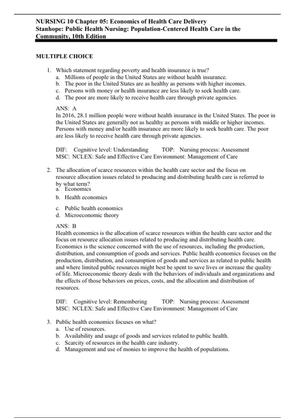 NURSING 10 Chapter 05: Economics of Health Care Delivery Stanhope: Public Health Nursing: Population-Centered Health Care in the Community, 10th Edition MULTIPLE CHOICE 1. Which statement regarding poverty and health insurance is true? a. Millions of people in the United States are without health insurance. b. The poor in the United States are as healthy as persons with higher incomes. c. Persons with money or health insurance are less likely to seek health care. d. The poor are more likely to receive health care through private agencies. ANS: A In 2016, 28.1 million people were without health insurance in the United States. The poor in the United States are generally not as healthy as persons with middle or higher incomes. Persons with money and/or health insurance are more likely to seek health care. The poor are less likely to receive health care through private agencies. DIF: Cognitive level: Understanding TOP: Nursing process: Assessment MSC: NCLEX: Safe and Effective Care Environment: Management of Care 2. The allocation of scarce resources within the health care sector and the focus on resource allocation issues related to producing and distributing health care is referred to by what term? a. Economics b. Health economics c. Public health economics d. Microeconomic theory ANS: B Health economics is the allocation of scarce resources within the health care sector and the focus on resource allocation issues related to producing and distributing health care. Economics is the science concerned with the use of resources, including the production, distribution, and consumption of goods and services. Public health economics focuses on the production, distribution, and consumption of goods and services as related to public health and where limited public resources might best be spent to save lives or increase the quality of life. Microeconomic theory deals with the behaviors of individuals and organizations and the effects of those behaviors on prices, costs, and the allocation and distribution of resources. DIF: Cognitive level: Remembering TOP: Nursing process: Assessment MSC: NCLEX: Safe and Effective Care Environment: Management of Care 3. Public health economics focuses on what? a. Use of resources. b. Availability and usage of goods and services related to public health. c. Scarcity of resources in the health care industry. d. Management and use of monies to improve the health of populations. ANS: B Public health economics focuses on producing, distributing, and consuming goods and services related to public health. Economics is the science concerned with the use of resources, including the production, distribution, and consumption of goods and services. Health economics is the allocation of scarce resources within the health care sector and the focus on resource allocation issues related to producing and distributing health care. Public health finance involves the acquiring, managing, and use of monies to improve the health of populations through disease prevention and health promotion strategies. DIF: Cognitive level: Understanding TOP: Nursing process: Assessment MSC: NCLEX: Safe and Effective Care Environment: Management of Care 4. A nurse discusses services with a federal Congressional representative. Which service would the nurse most likely be discussing? a. Family planning b. Counseling c. Policy making d. Prevention of communicable diseases ANS: C Policy making is offered at the federal level. Family planning, counseling, and preventing communicable and infectious disease are offered at the state and local levels. DIF: Cognitive level: Understanding TOP: Nursing process: Implementation MSC: NCLEX: Safe and Effective Care Environment: Management of Care 5. A business offers wellness NinceRntivIes tGo itBs e.mCploMyees and then notices a decrease in the frequency of physician visits among employees. Which term best describes what has happened? a. Macroeconomic theory b. Efficiency c. Supply and demand d. Microeconomic theory ANS: D Microeconomic theory is examining the behaviors of individuals and organizations that result from trade-offs in utility and budget constraints of health care. Efficiency refers to producing maximum output using a given set of resources. Supply and demand are two basic principles of microeconomic theory. Macroeconomic theory focuses on the “big picture.” DIF: Cognitive level: Understanding TOP: Nursing process: Evaluation MSC: NCLEX: Safe and Effective Care Environment: Management of Care 6. A nurse is using the principles of supply and demand in daily practice. Which situation describes this phenomenon? a. The demand for nurses in public health is low, but the supply is high. b. When few goods or services are available, the price tends to rise. c. When supplies are low, nurses must find alternate resources. d. Lesser-developed countries receive supplies from other countries. ANS: B Supply and demand is in force when few goods or services are available, and then the price tends to rise. The other examples do not demonstrate the use of the laws of supply and demand. DIF: Cognitive level: Analyzing TOP: Nursing process: Evaluation MSC: NCLEX: Safe and Effective Care Environment: Management of Care 7. A nurse is faced with a macroeconomics issue. Which situation describes what is happening? a. The evaluation of client access to services b. A health policy that makes the development of a new program possible c. Informing clients and others of the cost of service d. The referral of clients to available services ANS: B Macroeconomics focuses on the “big picture,” such as a program, whereas microeconomics focuses on the individual or organization. DIF: Cognitive level: Analyzing TOP: Nursing process: Evaluation MSC: NCLEX: Safe and Effective Care Environment: Management of Care 8. A public health nurse applies the principles of the macroeconomics theory when working with a community. Which statement best describes why this theory would be used? a. 