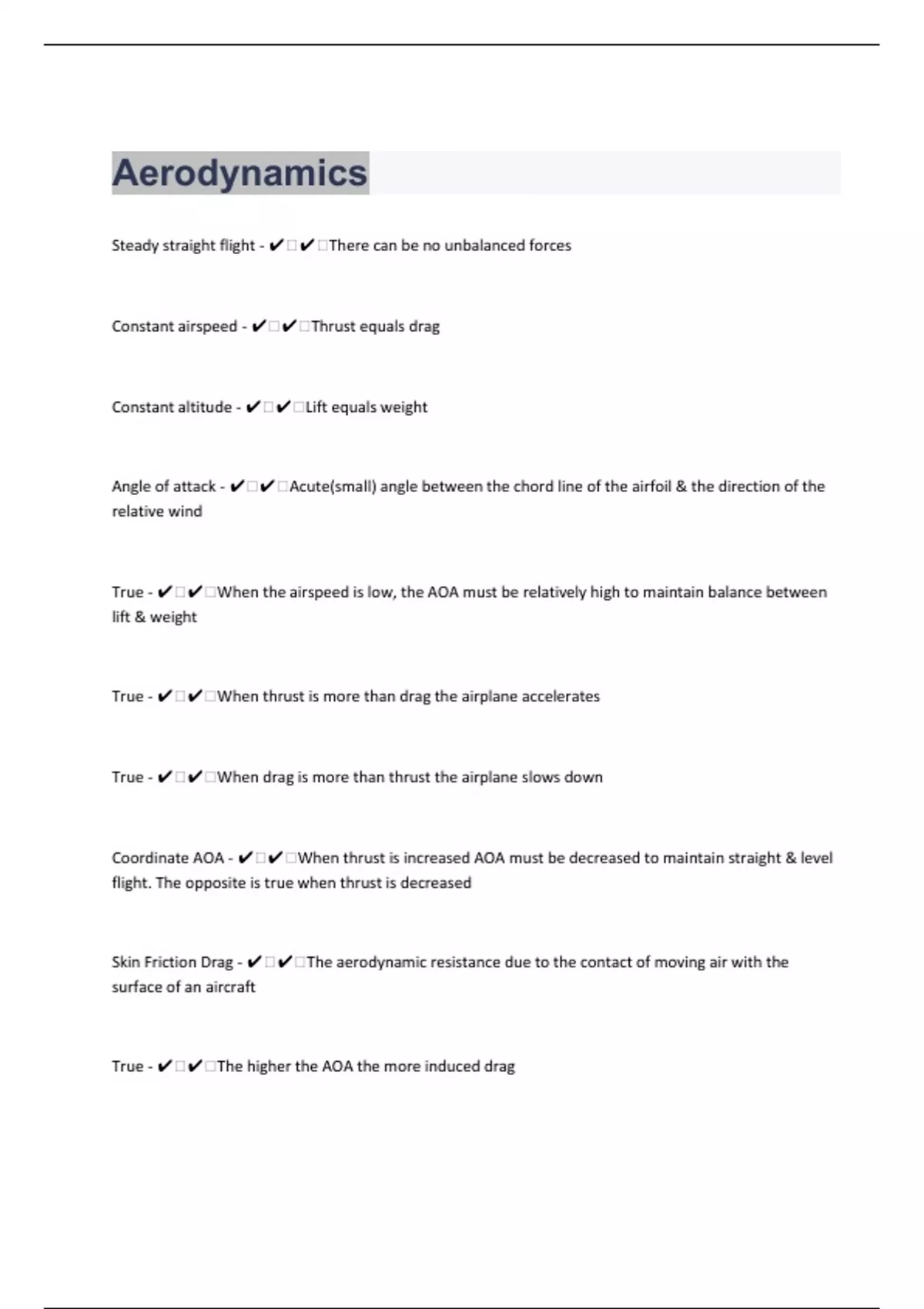 Steady straight flight - ️️There can be no unbalanced forces Constant airspeed - ️️Thrust equals drag Constant altitude - ️️Lift equals weight Angle of attack - ️️Acute(small) angle between the chord line of the airfoil & the direction of the relative wind True - ️️When the airspeed is low, the AOA must be relatively high to maintain balance between lift & weight True - ️️When thrust is more than drag the airplane accelerates True - ️️When drag is more than thrust the airplane slows down Coordinate AOA - ️️When thrust is increased AOA must be decreased to maintain straight & level flight. The opposite is true when thrust is decreased Skin Friction Drag - ️️The aerodynamic resistance due to the contact of moving air with the surface of an aircraft True - ️️The higher the AOA the more induced drag