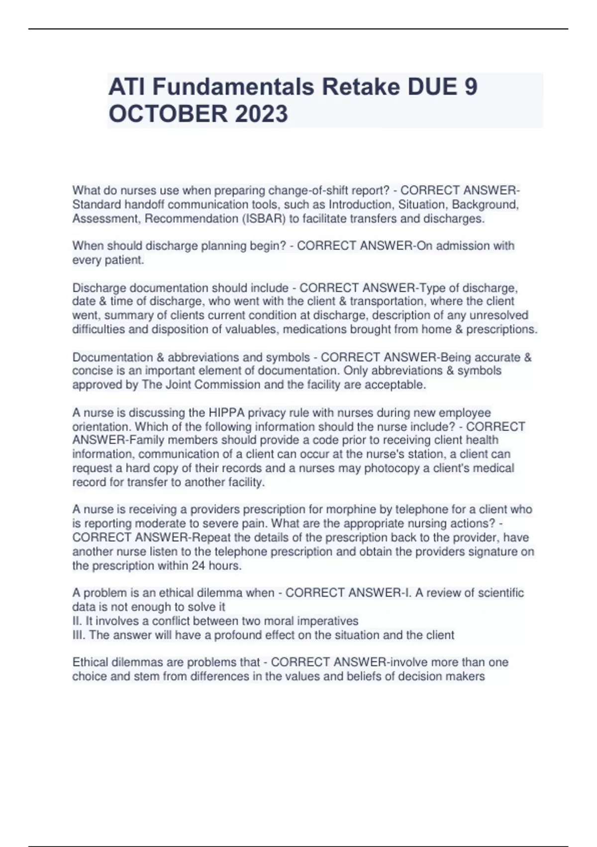 ATI Fundamentals Retake DUE 9 OCTOBER 2023 What do nurses use when preparing change-of-shift report? - CORRECT ANSWERStandard handoff communication tools, such as Introduction, Situation, Background, Assessment, Recommendation (ISBAR) to facilitate transfers and discharges. When should discharge planning begin? - CORRECT ANSWER-On admission with every patient. Discharge documentation should include - CORRECT ANSWER-Type of discharge, date & time of discharge, who went with the client & transportation, where the client went, summary of clients current condition at discharge, description of any unresolved difficulties and disposition of valuables, medications brought from home & prescriptions. Documentation & abbreviations and symbols - CORRECT ANSWER-Being accurate & concise is an important element of documentation. Only abbreviations & symbols approved by The Joint Commission and the facility are acceptable. A nurse is discussing the HIPPA privacy rule with nurses during new employee orientation. Which of the following information should the nurse include? - CORRECT ANSWER-Family members should provide a code prior to receiving client health information, communication of a client can occur at the nurse's station, a client can request a hard copy of their records and a nurses may photocopy a client's medical record for transfer to another facility. A nurse is receiving a providers prescription for morphine by telephone for a client who is reporting moderate to severe pain. What are the appropriate nursing actions? - CORRECT ANSWER-Repeat the details of the prescription back to the provider, have another nurse listen to the telephone prescription and obtain the providers signature on the prescription within 24 hours. A problem is an ethical dilemma when - CORRECT ANSWER-I. A review of scientific data is not enough to solve it II. It involves a conflict between two moral imperatives III. The answer will have a profound effect on the situation and the client Ethical dilemmas are problems that - CORRECT ANSWER-involve more than one choice and stem from differences in the values and beliefs of decision makers Autonomy - CORRECT ANSWER-the right to makes one's own personal decisions, even when those decisions might not be in the that person's best interest. Beneifience - CORRECT ANSWER-positive actions to help others (do good) Fidelity - CORRECT ANSWER-agreement to keep promises Justice - CORRECT ANSWER-fairness in care delivery and use of resources Nonmaleficence - CORRECT ANSWER-avoidance of harm or injury (do no harm) Admission inventory of personal items include - CORRECT ANSWER-clothing, jewelry, money, credit cards, assistive devices, medications, cell phones and other technology devices, and religious articles... Nurses should discourage keeping valuables at the bedside. The nurse will document what related to personal items? - CORRECT ANSWER-The nurse will document communication with the client related to items left within the room and valuables locked in the facility's safe. Assault (International Tort) - CORRECT ANSWER-The conduct of one person makes another person fearful and apprehensive. Example: a nurse threatens to place an NG tube in a client who is refusing to eat. Battery (International Tort) - CORRECT ANSWER-Intentional & wrongful physical contract with a person that involves an injury of offensive contact. Example: A nurse restrains a client and administers an injection against her wishes. False Imprisonment (International Tort) - CORRECT ANSWER-A person is confined or retained against his will. The nurses uses restraints on a competent client to prevent his leaving the health care facility. What should the nurse teach older clients about home safety? - CORRECT ANSWERTo place electrical cords & extension cords against a wall behind furniture and use a nonskid mat in the tub or shower & place a shower chair in the shower and a beside commode if needed. The client who has heat stroke will have what sign? - CORRECT ANSWERHypotension One of the nurse's responsibility for a client in restraints is to make sure... - CORRECT ANSWER-the restraints are loose enough for range of motion & that there is enough room to fit two fingers between the restraints & the client. What is the priority action for a patient with a history of falls? - CORRECT ANSWERComplete a fall risk assessment